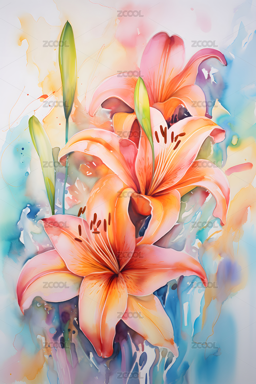 绚丽水彩百合花