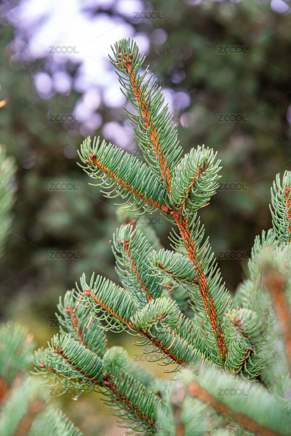 蓝云杉树枝上的水珠