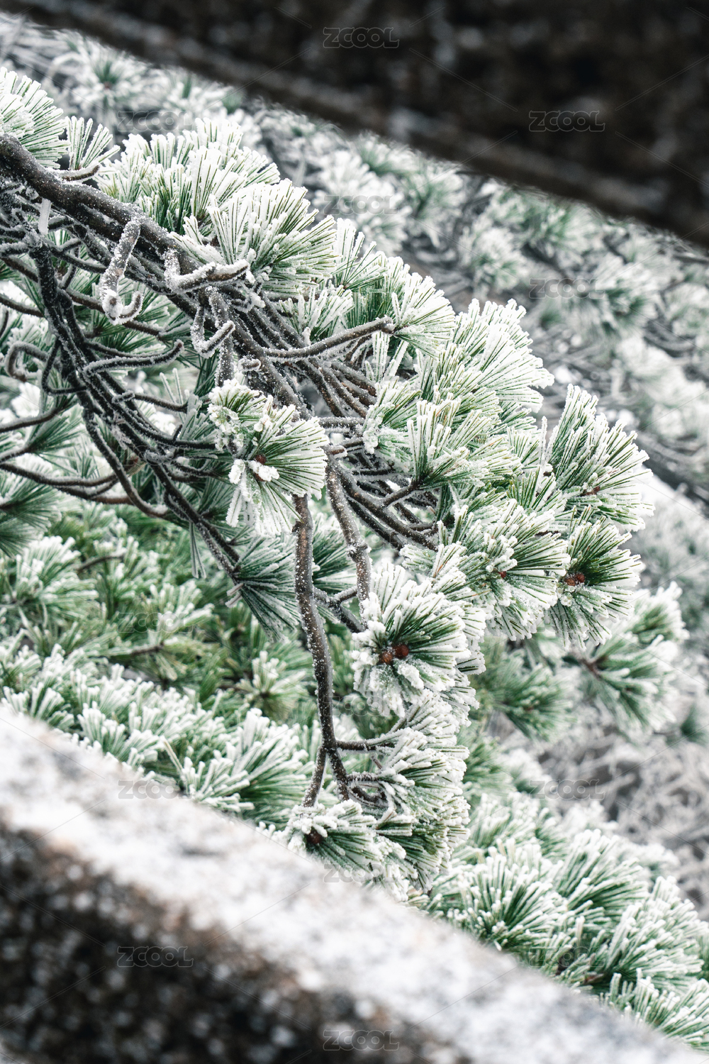 覆冰的绿色松树枝条敕木山雪淞