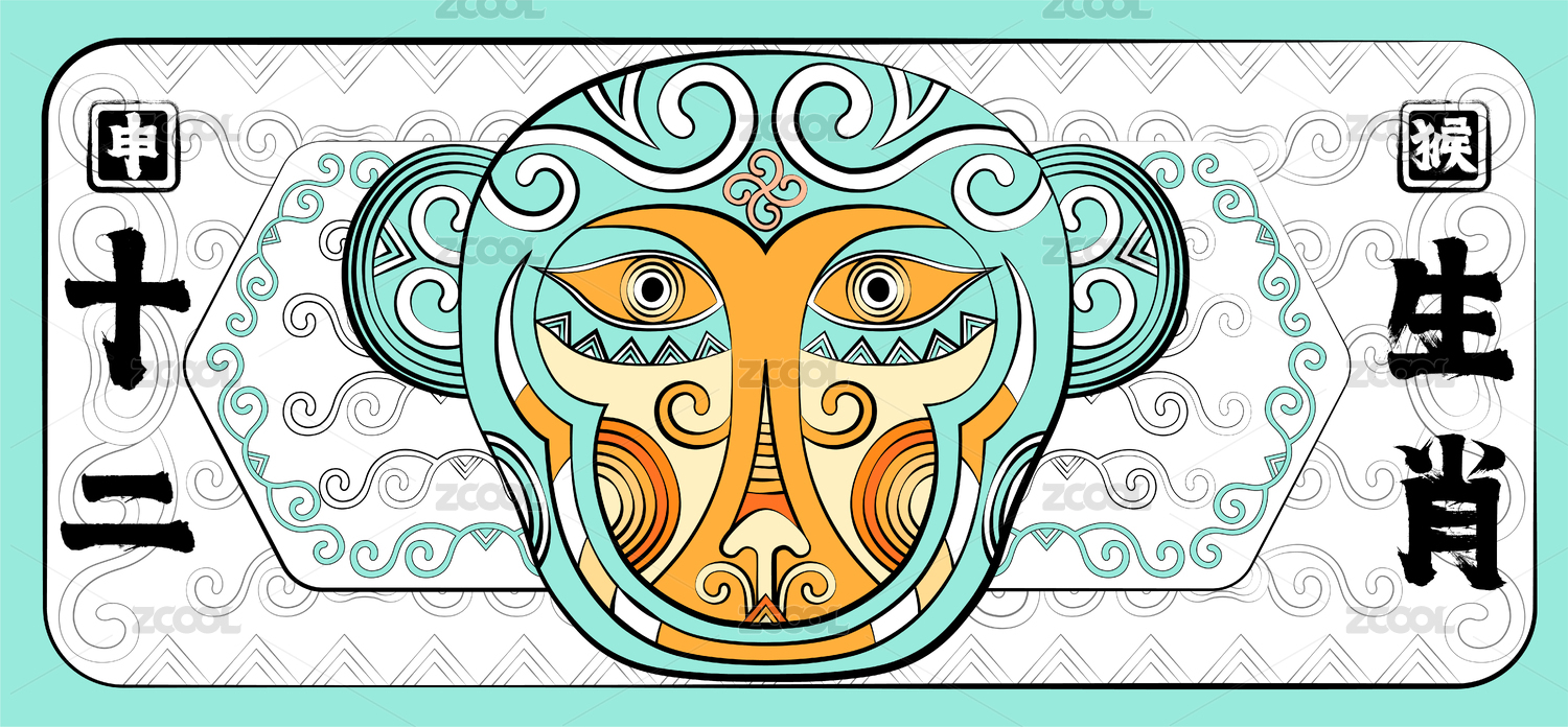 国潮申猴十二生肖印花潮流装饰纹样卡通形象