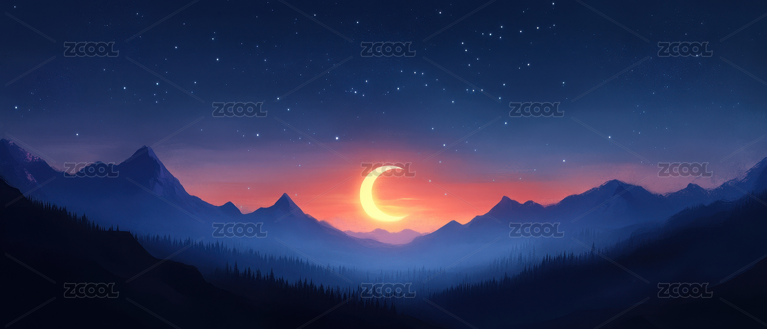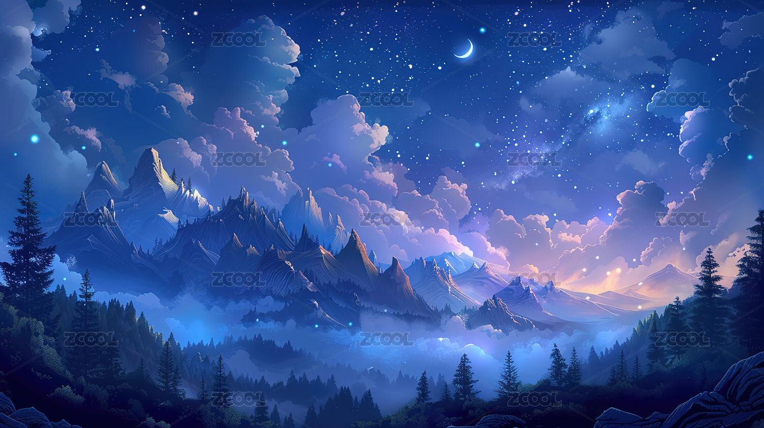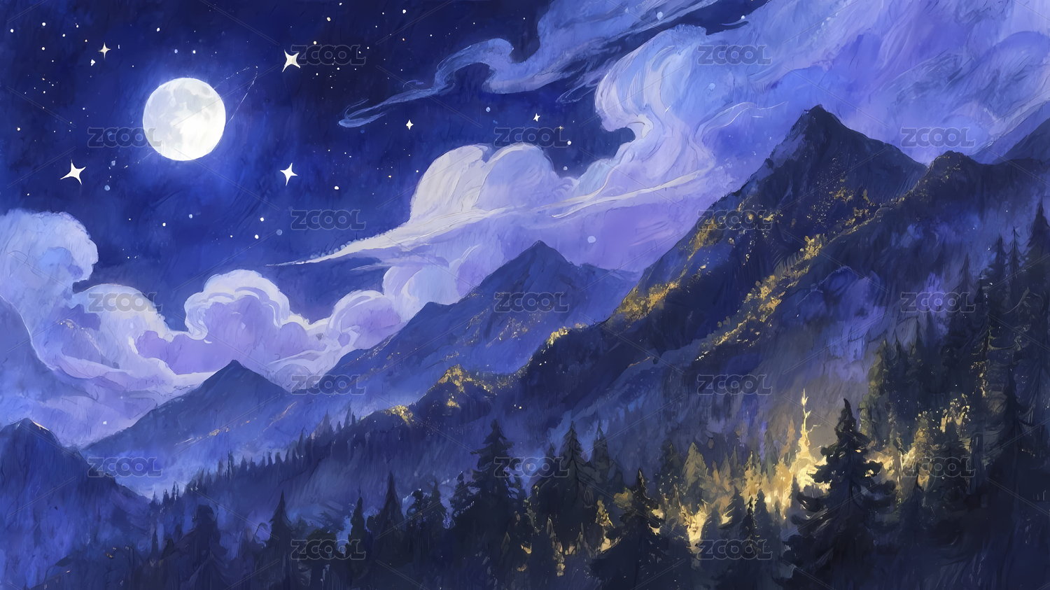 空旷,山峰,山林,山谷,幽静,云雾,月色,月亮