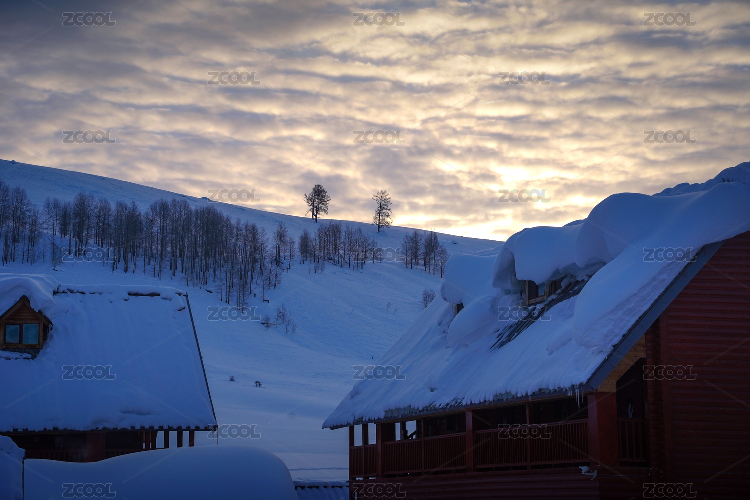 中国新疆冬天里禾木村和雪山和森林的雪景