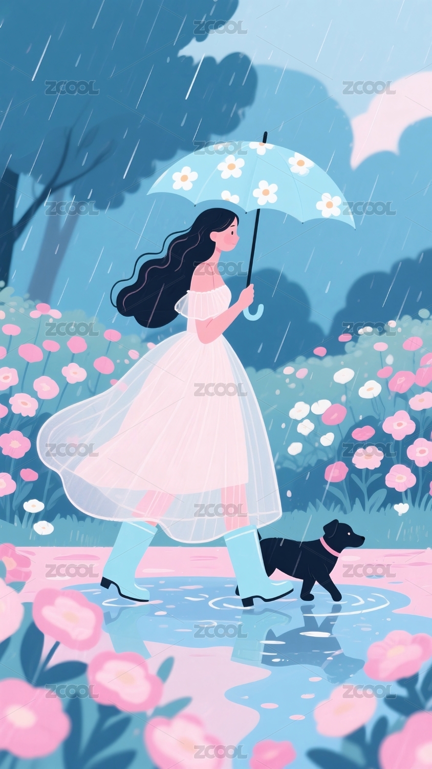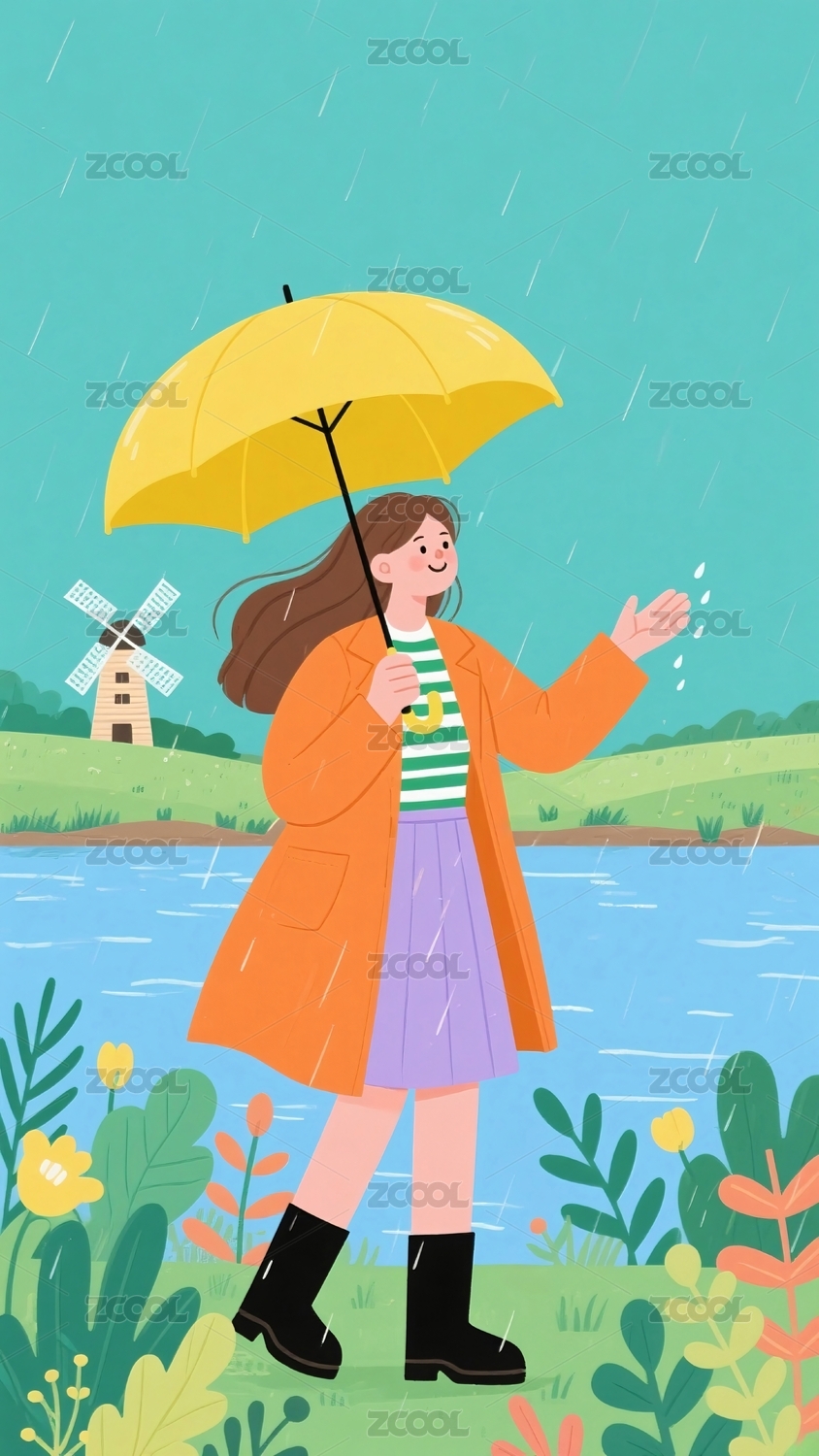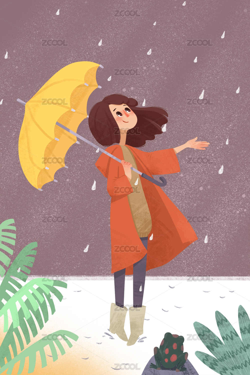 春天下雨春雨女孩打伞谷雨雨水节气插画