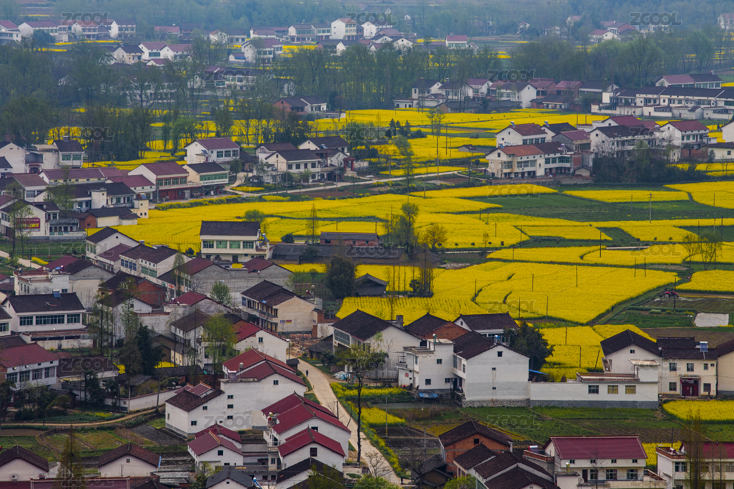 陕西省汉中市新集镇春天油菜花田绽放的村庄