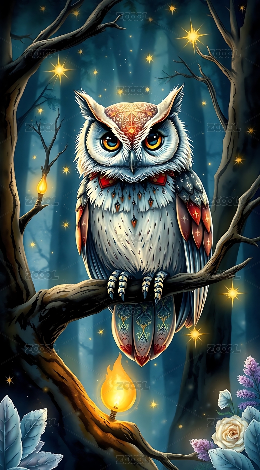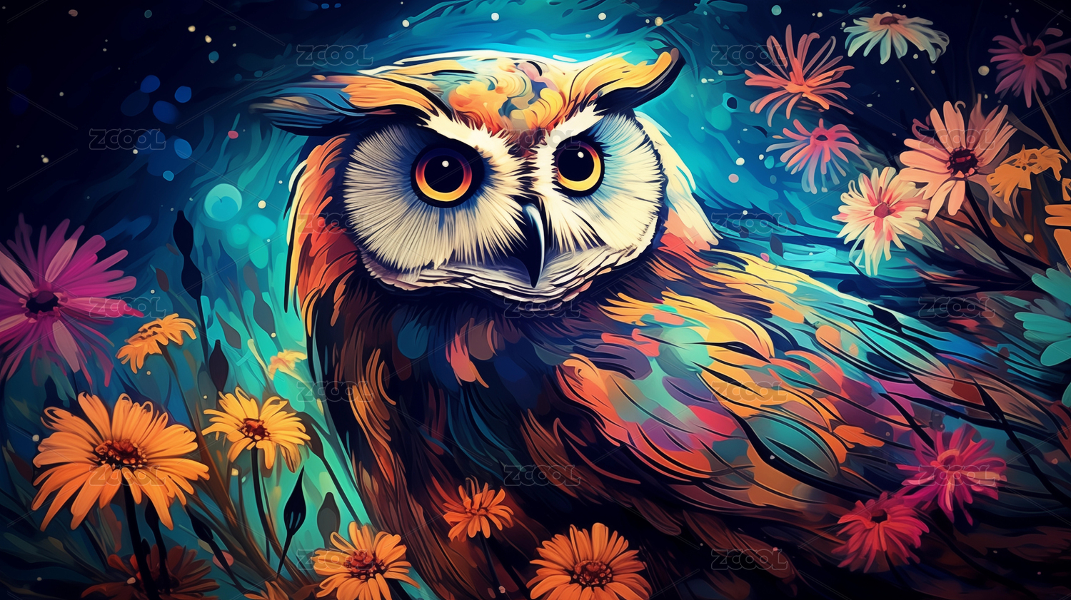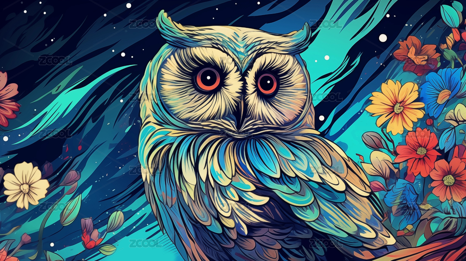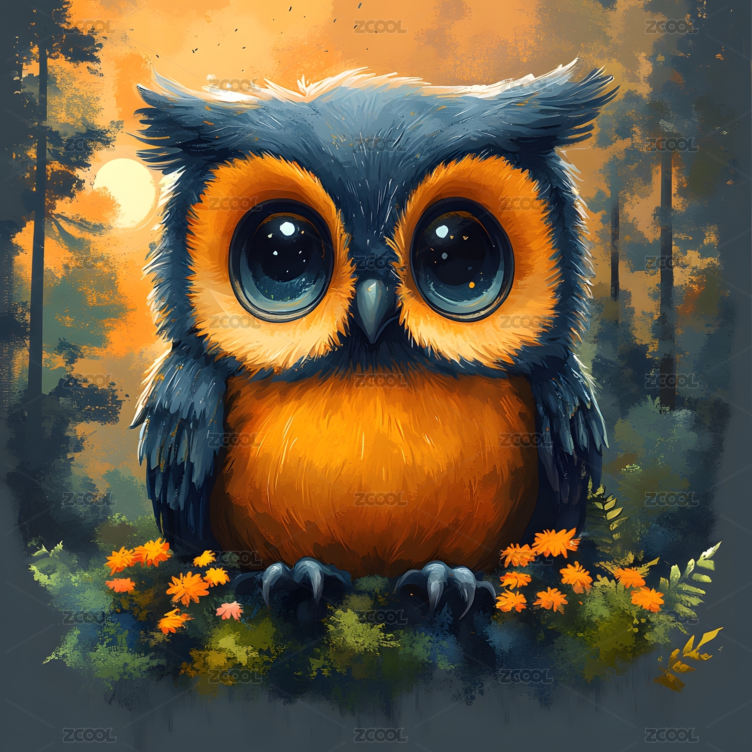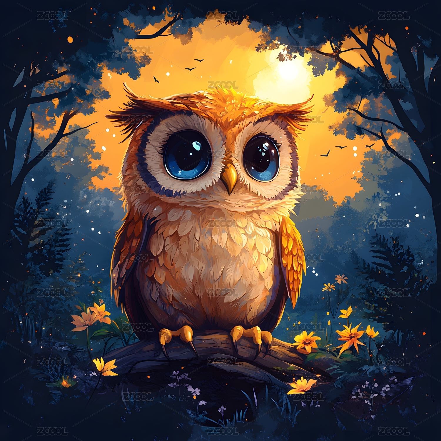 手绘卡通夜晚星空下花丛中的猫头鹰插画