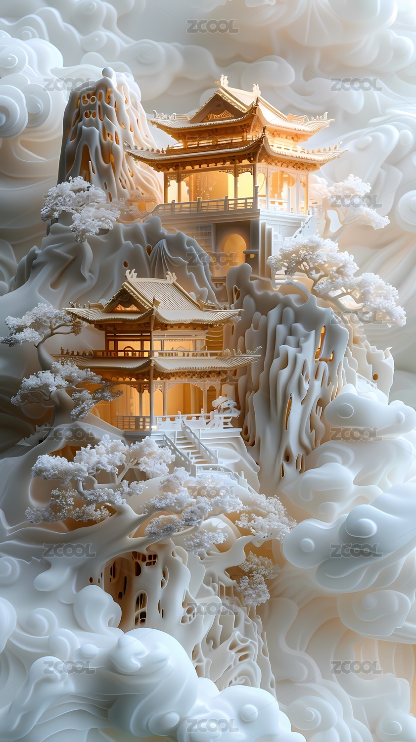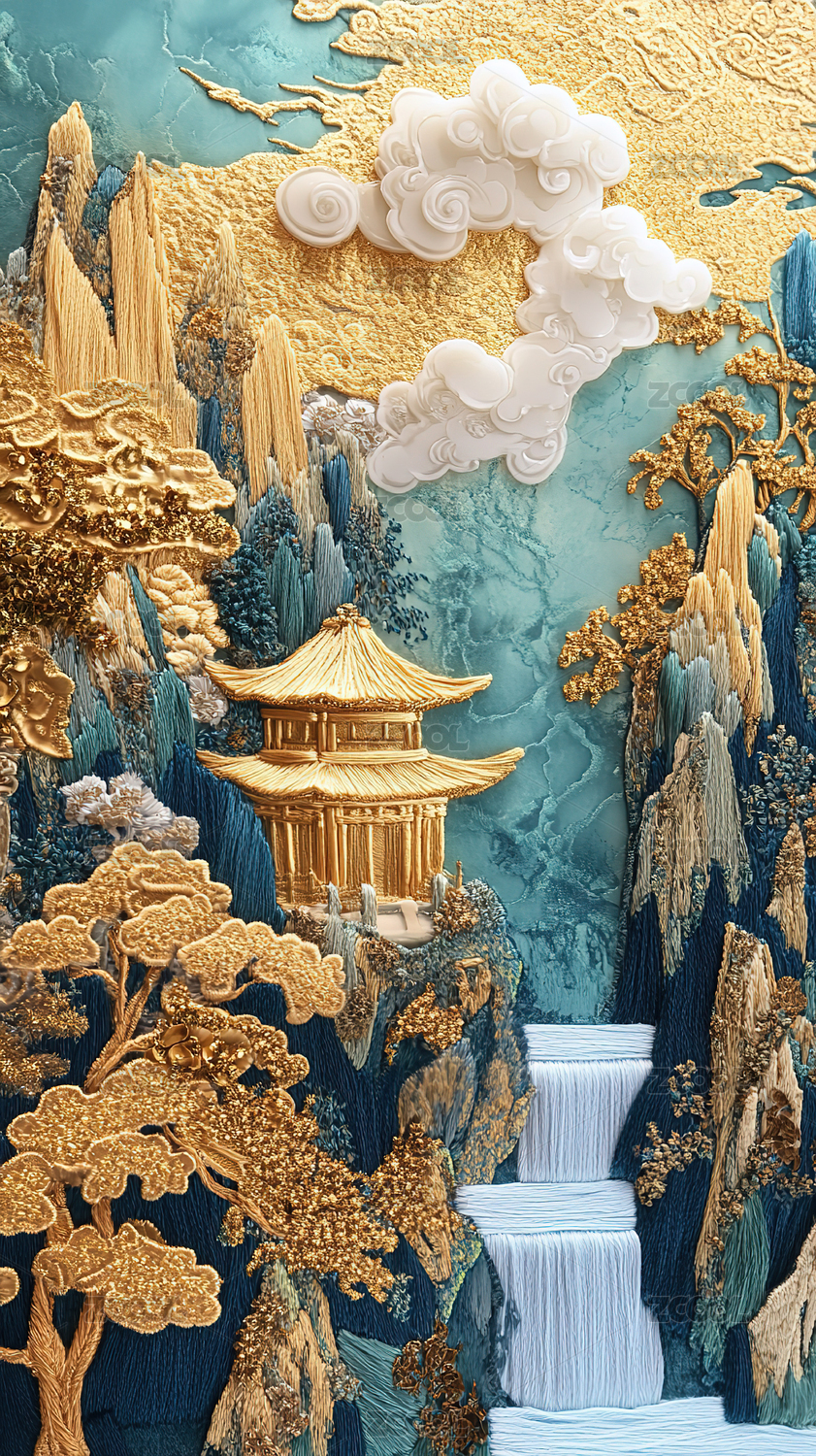 亭台,楼阁,中国风,金色,艺术,宁静,祥和,山峦,创意,优雅