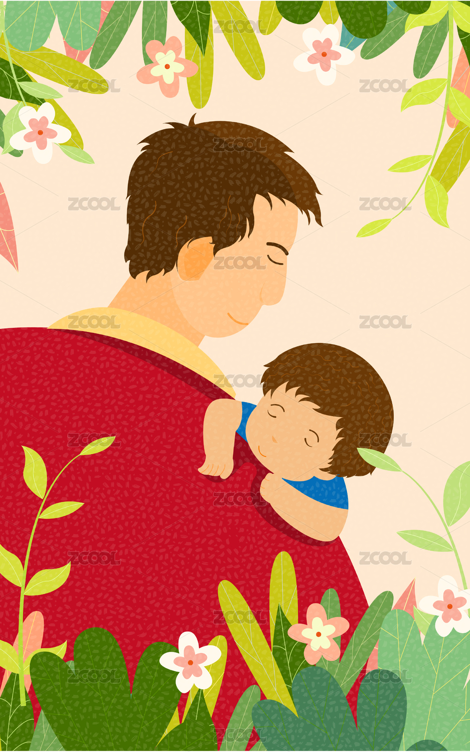 爸爸抱着熟睡婴儿的父亲节插画植物竖版白底
