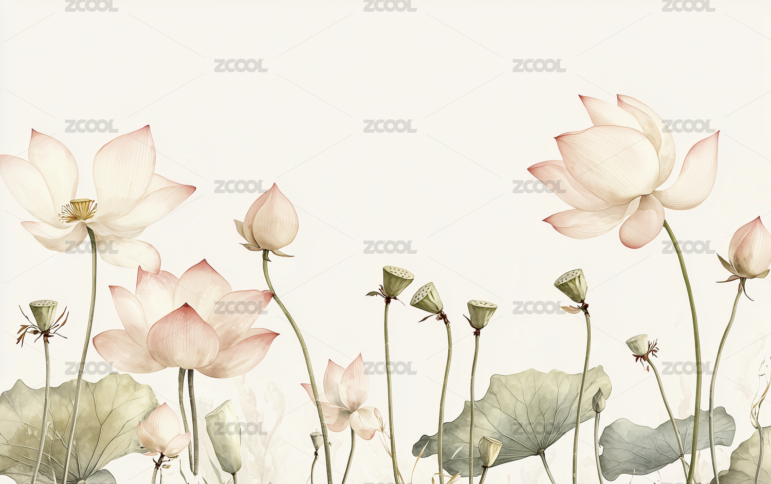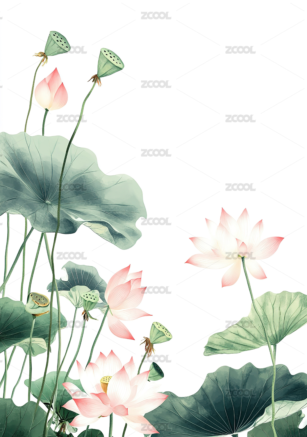 白底粉色莲花绿叶图
