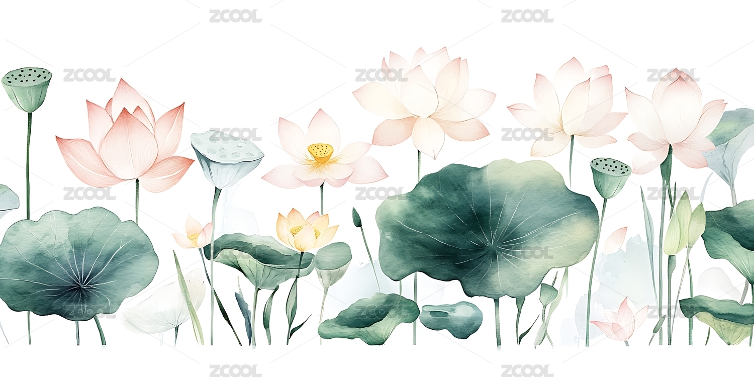 水彩风格荷塘荷叶荷花植物插画元素