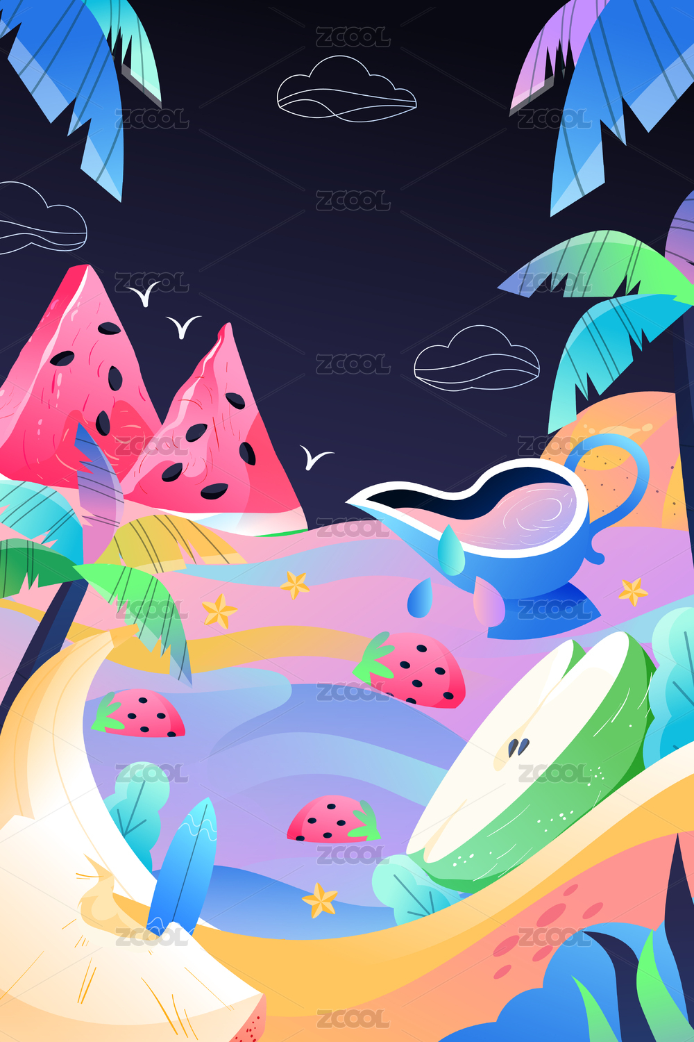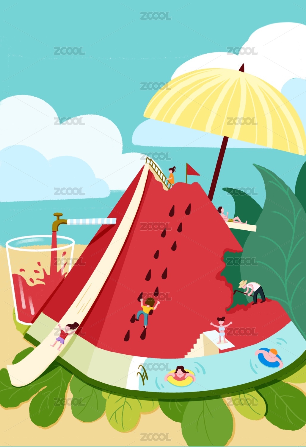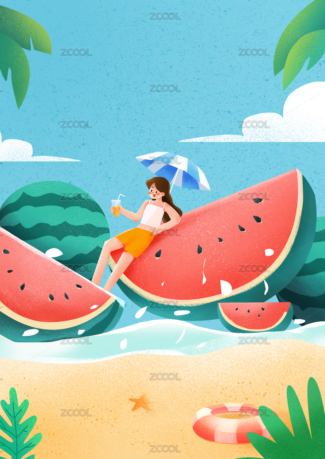 夏季,清爽,海边,插画,海报,大暑,小暑,夏至,二十四气节,西瓜节
