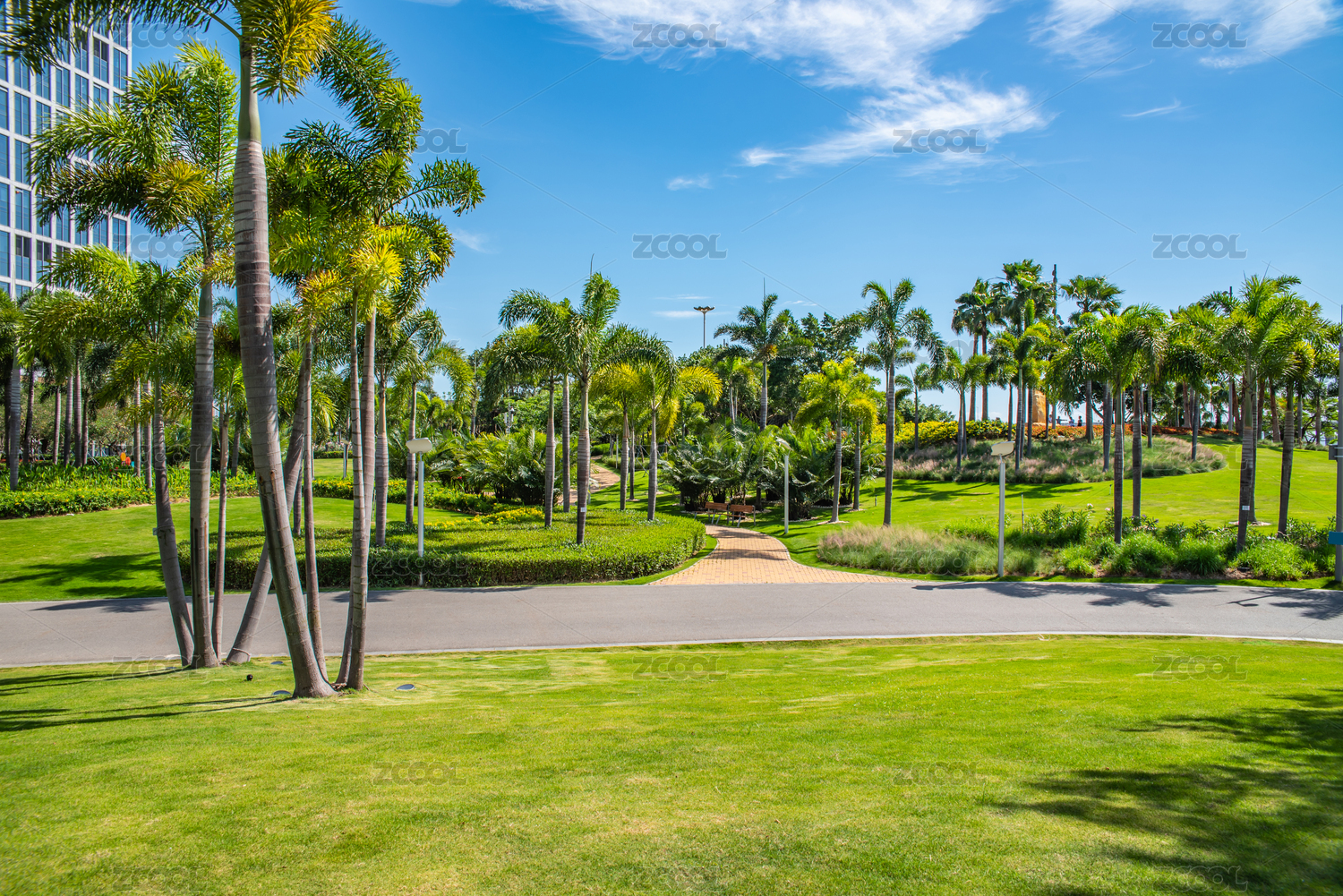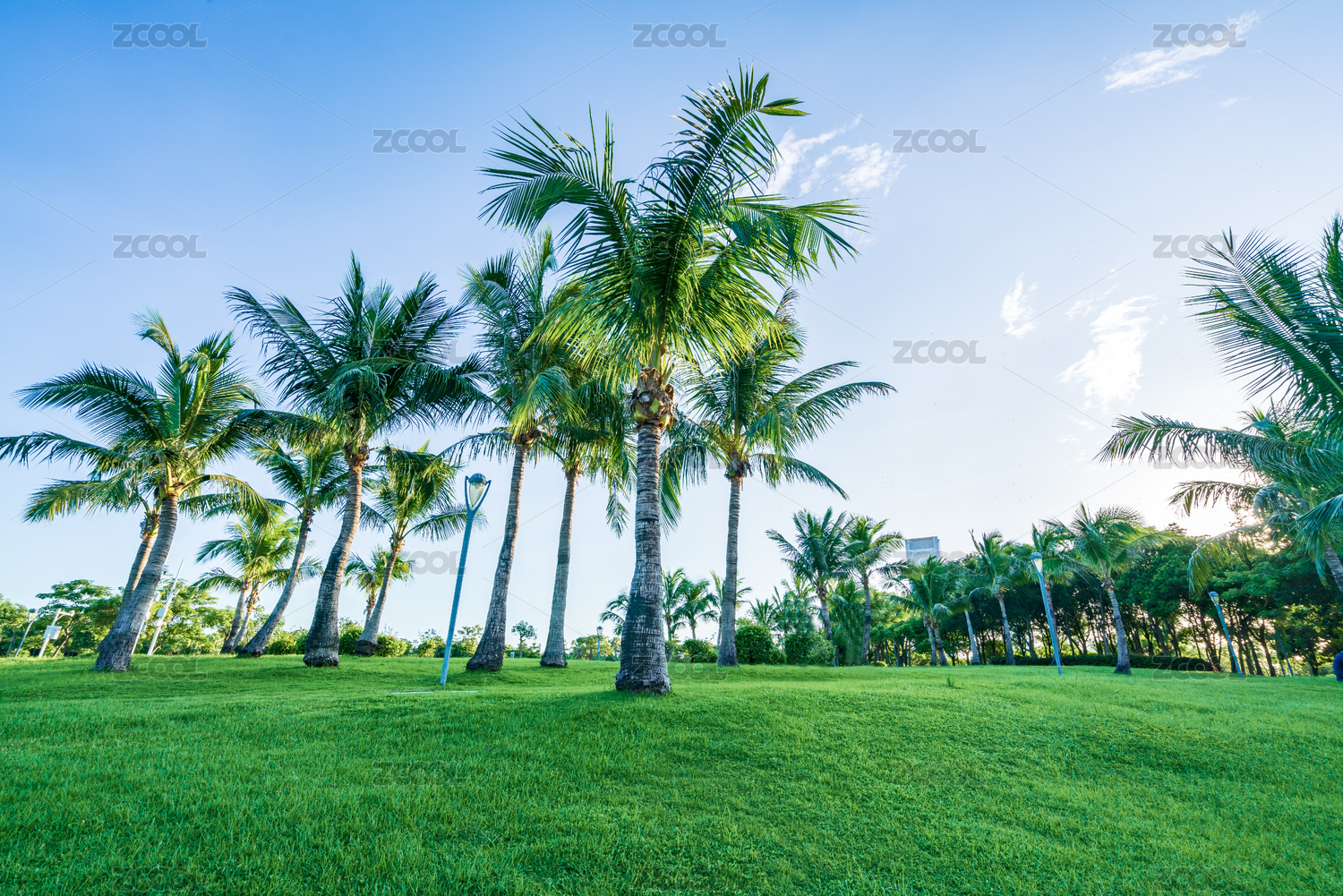中国广东深圳深圳湾草坪椰树蓝天白云海边