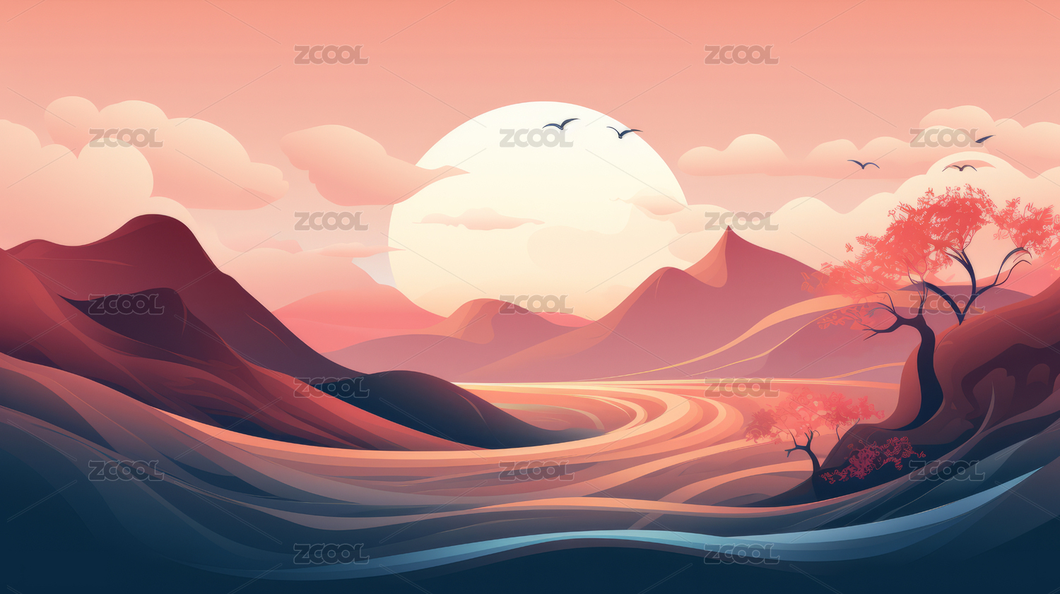 日落时分的山间风光 鸟儿在晚霞中飞翔的景