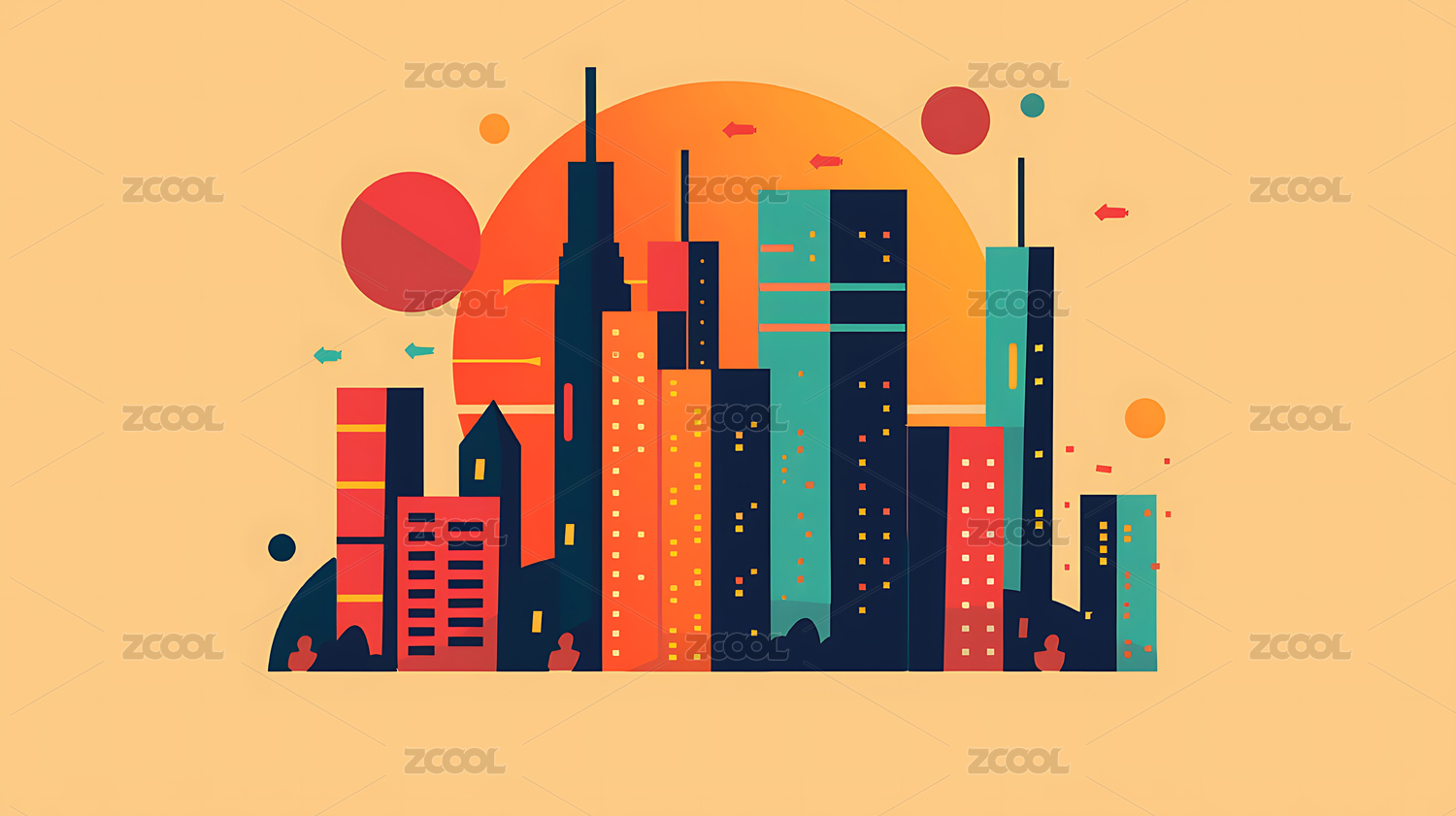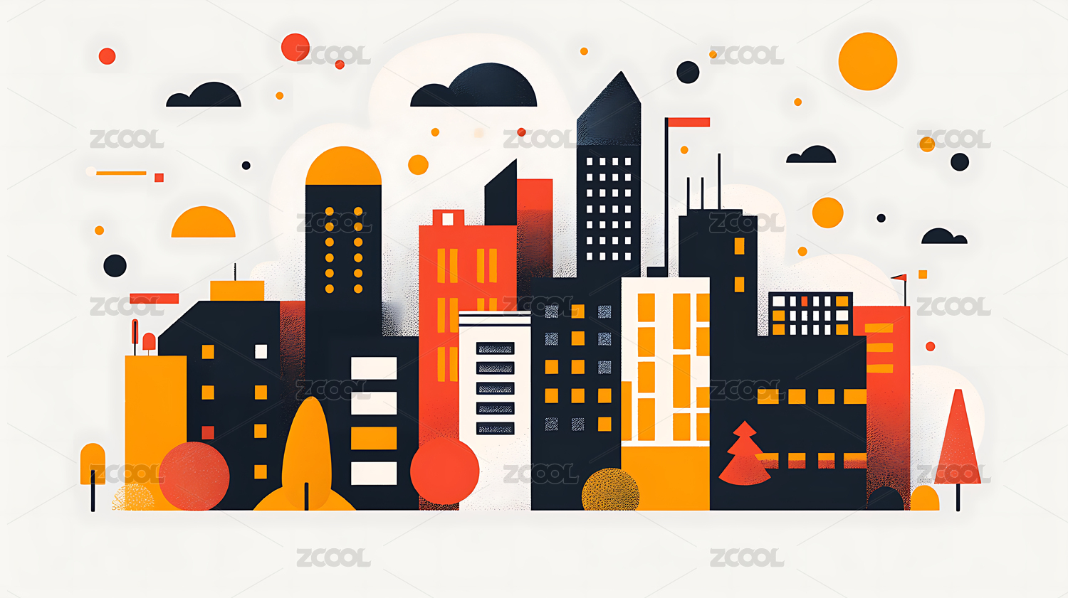 多彩建筑和树木的城市景观插画