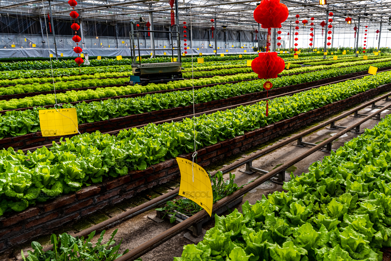 钢架大棚内成片种植的生菜