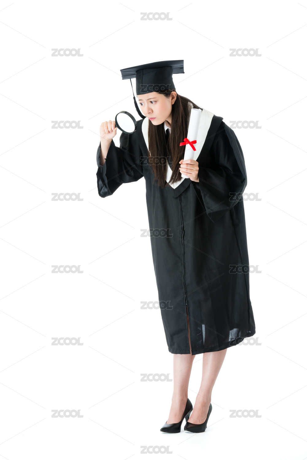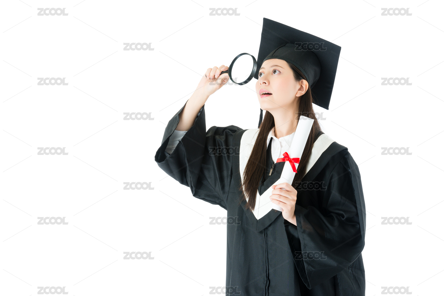 美丽优雅的大学生成品女人学习获得文凭,并使用放大镜查找隔绝在白色背景的未来工作穿着毕业服。