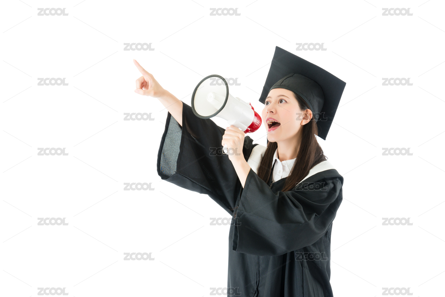 年轻漂亮的女孩穿着的学生在白色背景上思考未来扩音器大声毕业服装的地位。