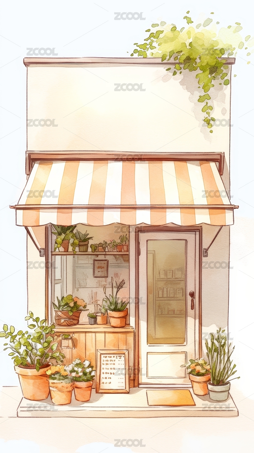 清新自然水彩春天花园洋房植物花盆装饰插画