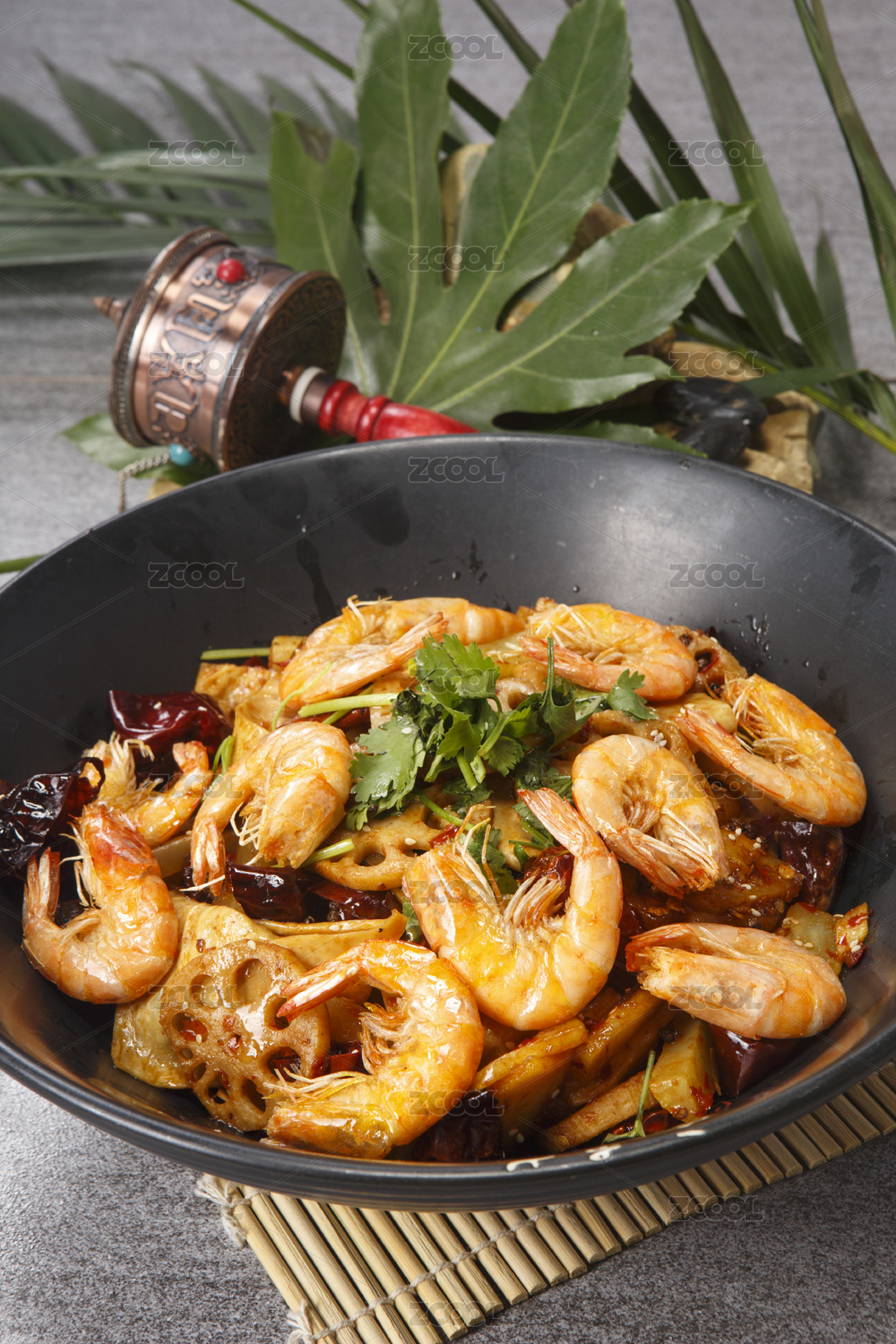 铁盆里的灯笼椒红油大虾鱿鱼须