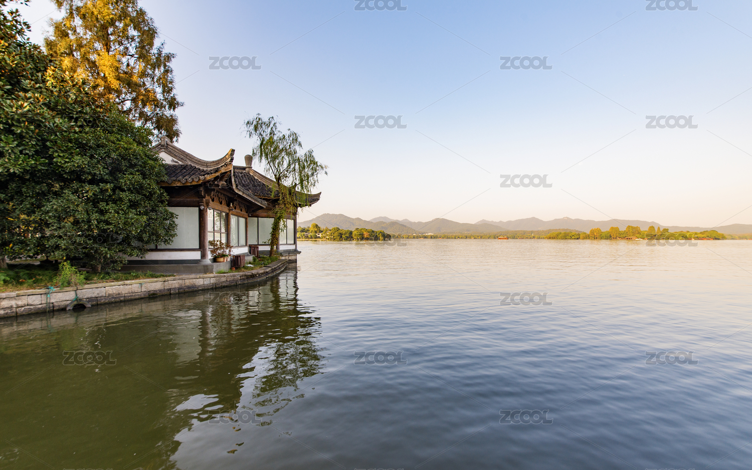夕阳下的中国北京颐和园的湖泊园林建筑