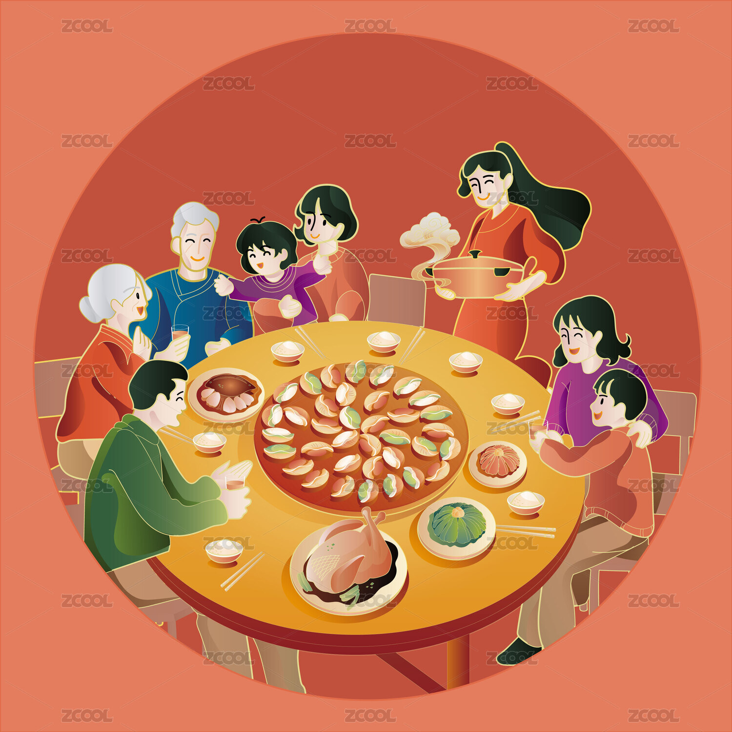春节家庭聚餐插画一家人吃团圆饭节日海报