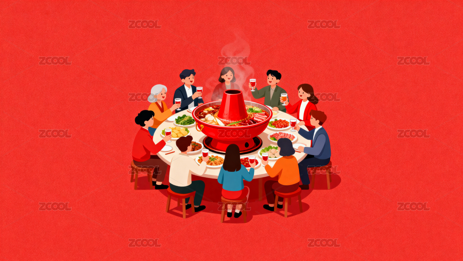 一家人团圆饭节日喜庆国潮红色横幅城市插画