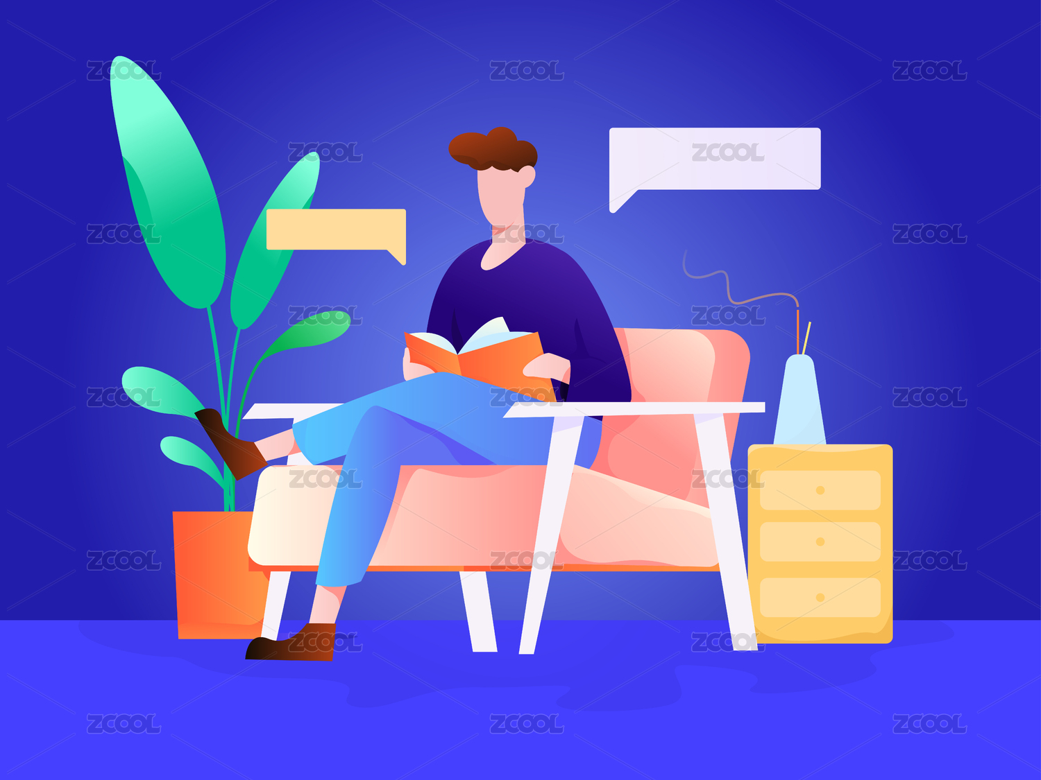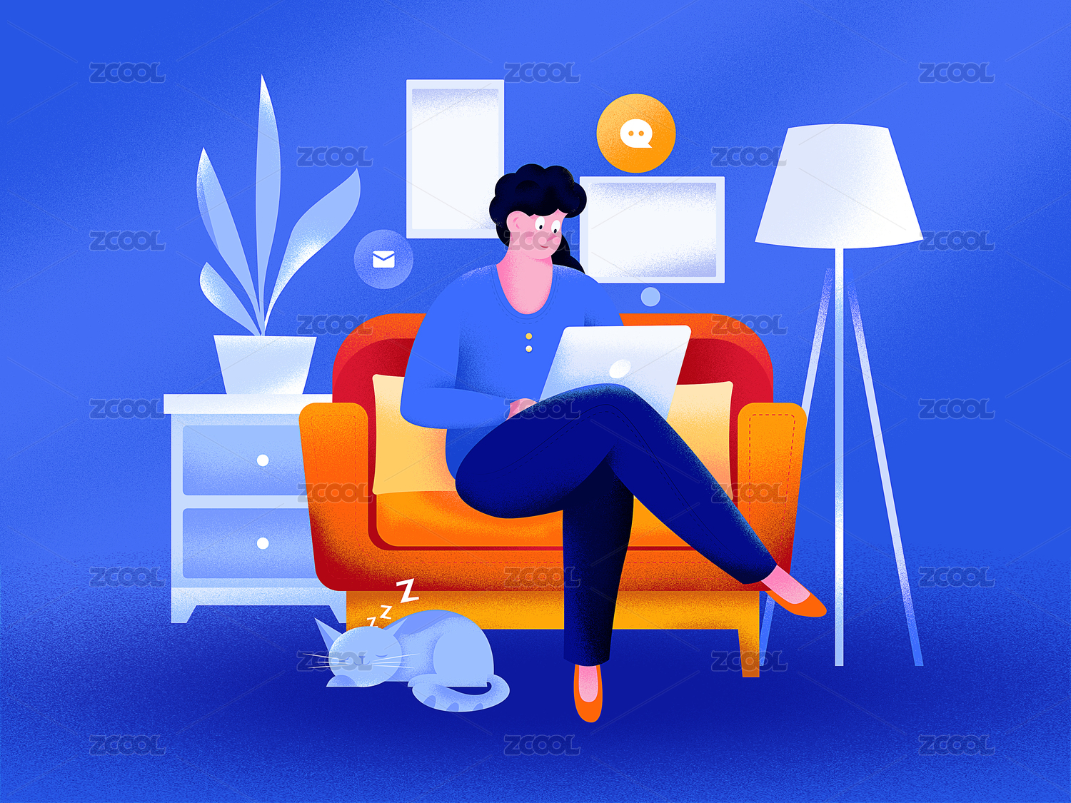 客厅里工作的女人, 手绘扁平人物场景创意概念插画