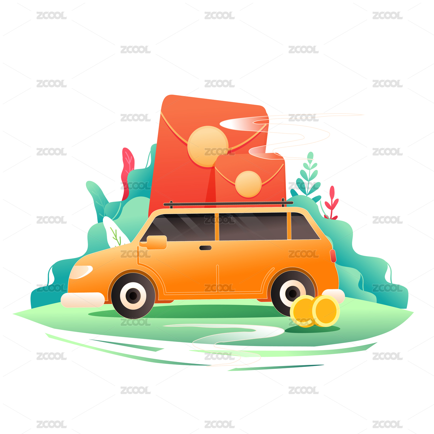 汽车车险礼盒插画车辆交通安全出行旅游海报
