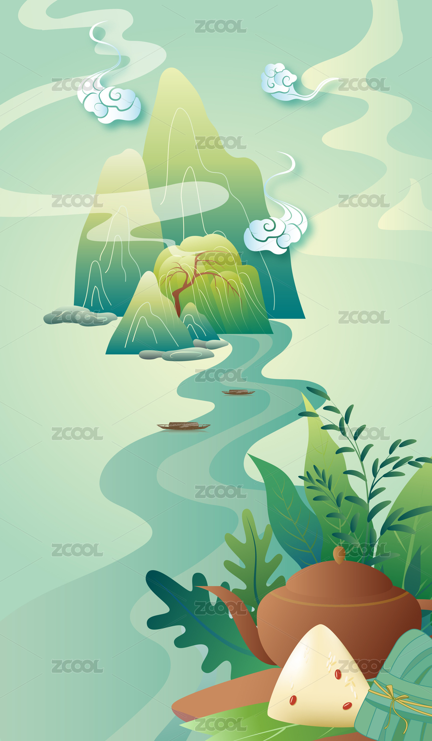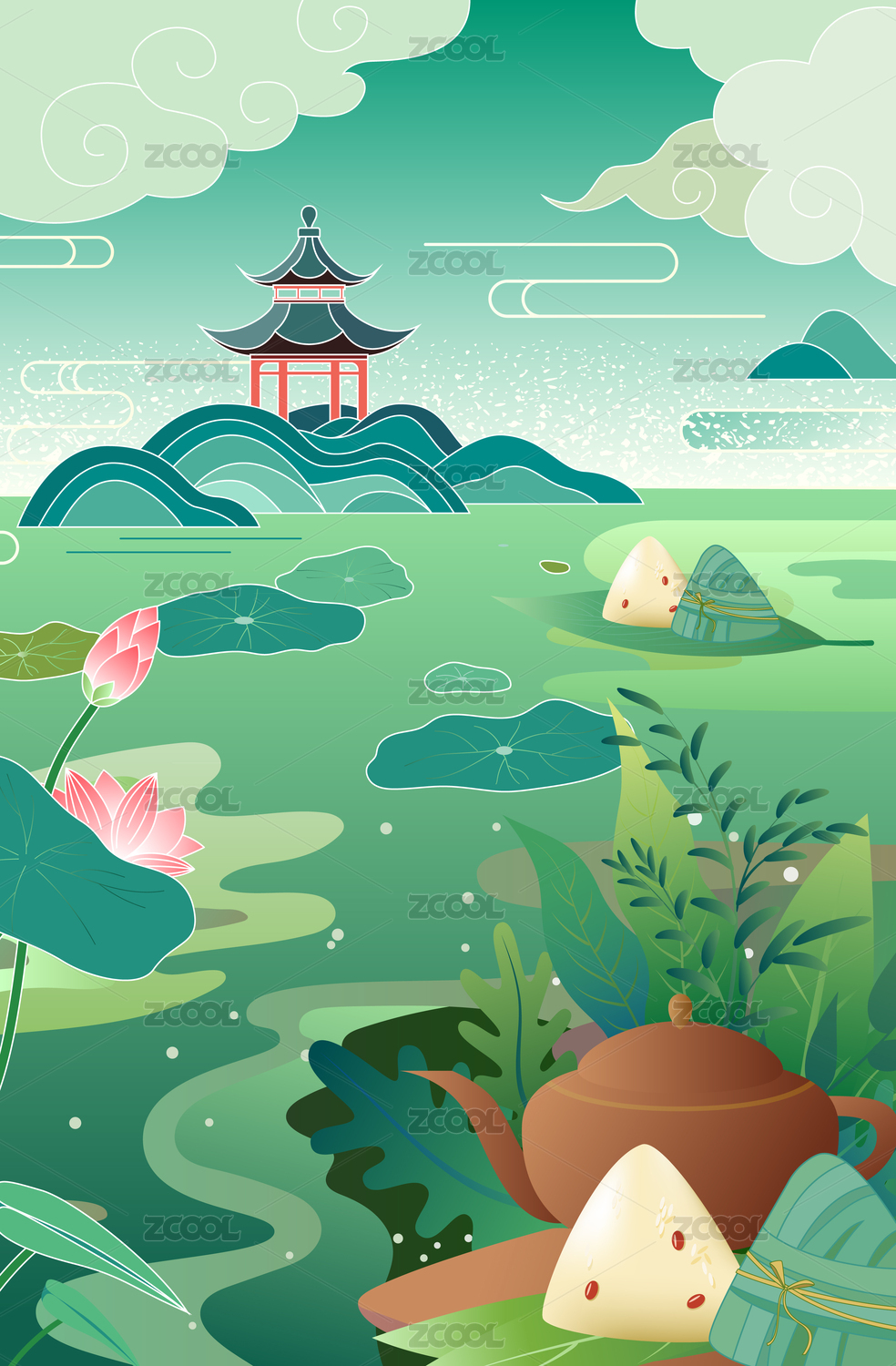 端午节赛龙舟传统节日建筑美食古风国潮插画