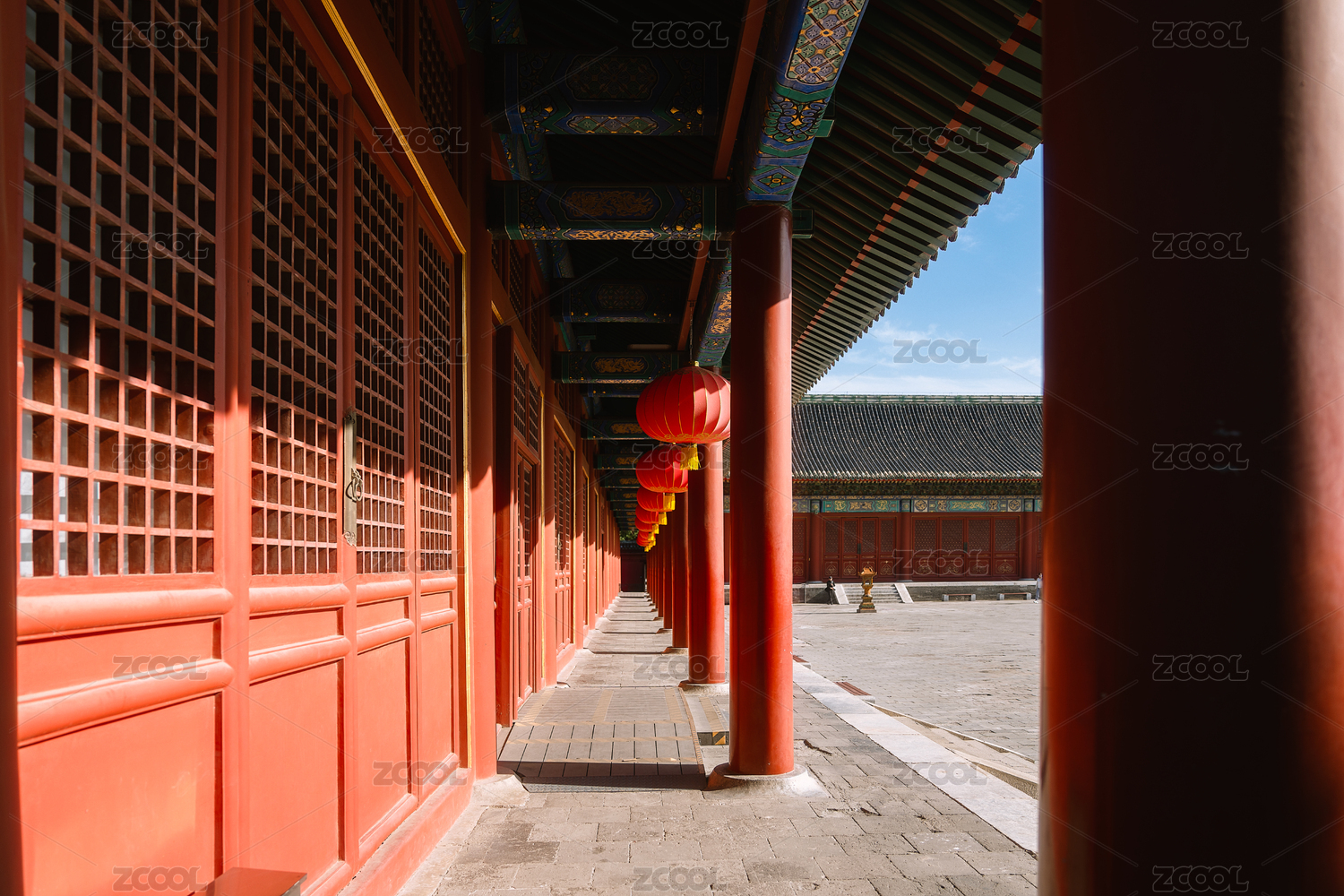 中国北京故宫午门里的隔扇门与朱漆檐柱