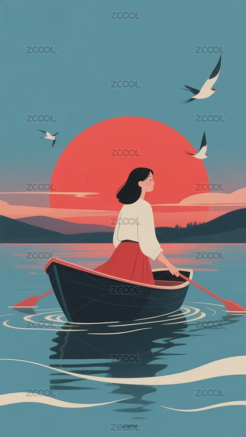 夕阳湖上独舟