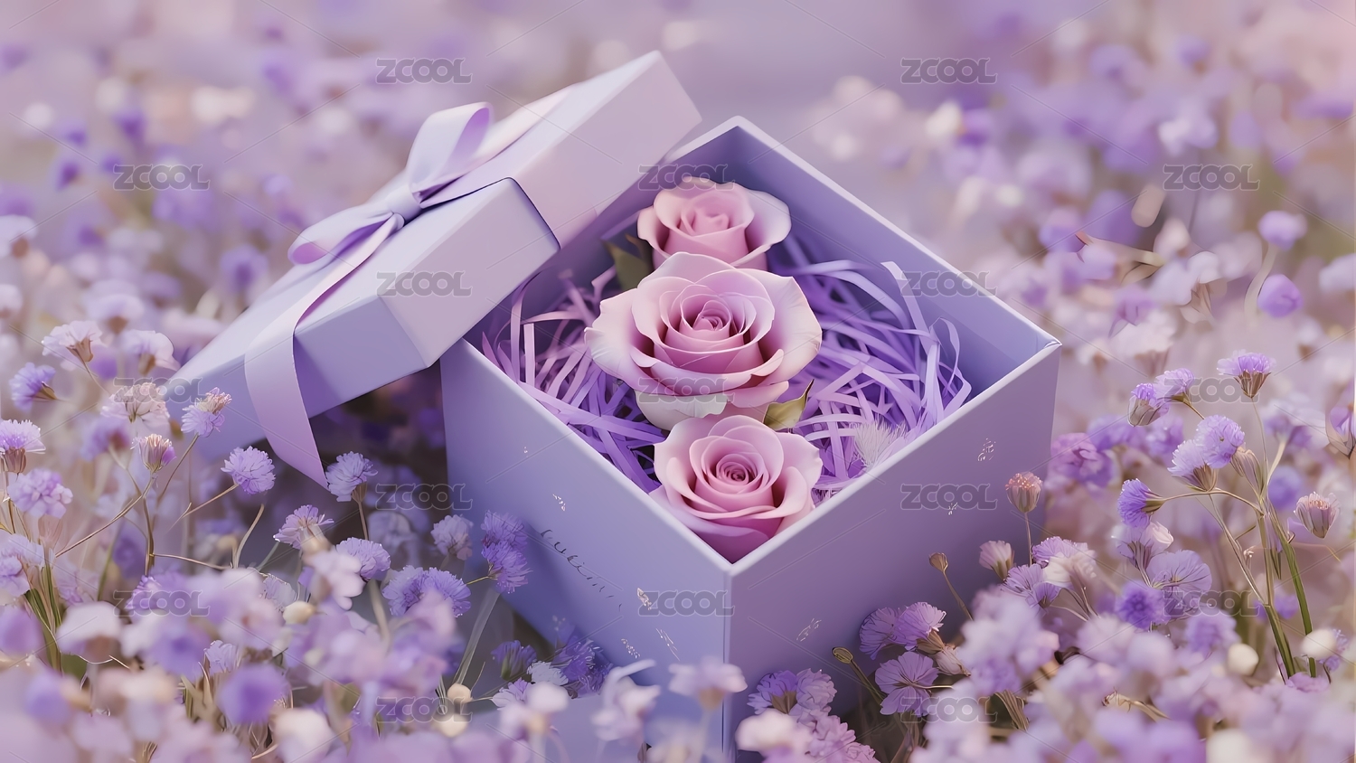 紫色玫瑰礼盒置于花海之中