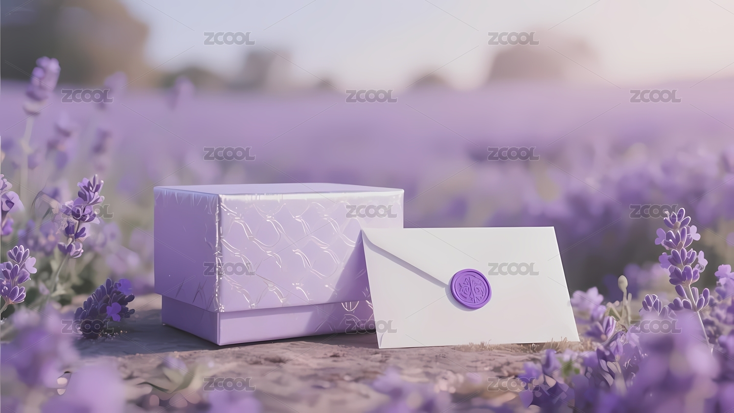 薰衣草田中的紫色礼盒与信封