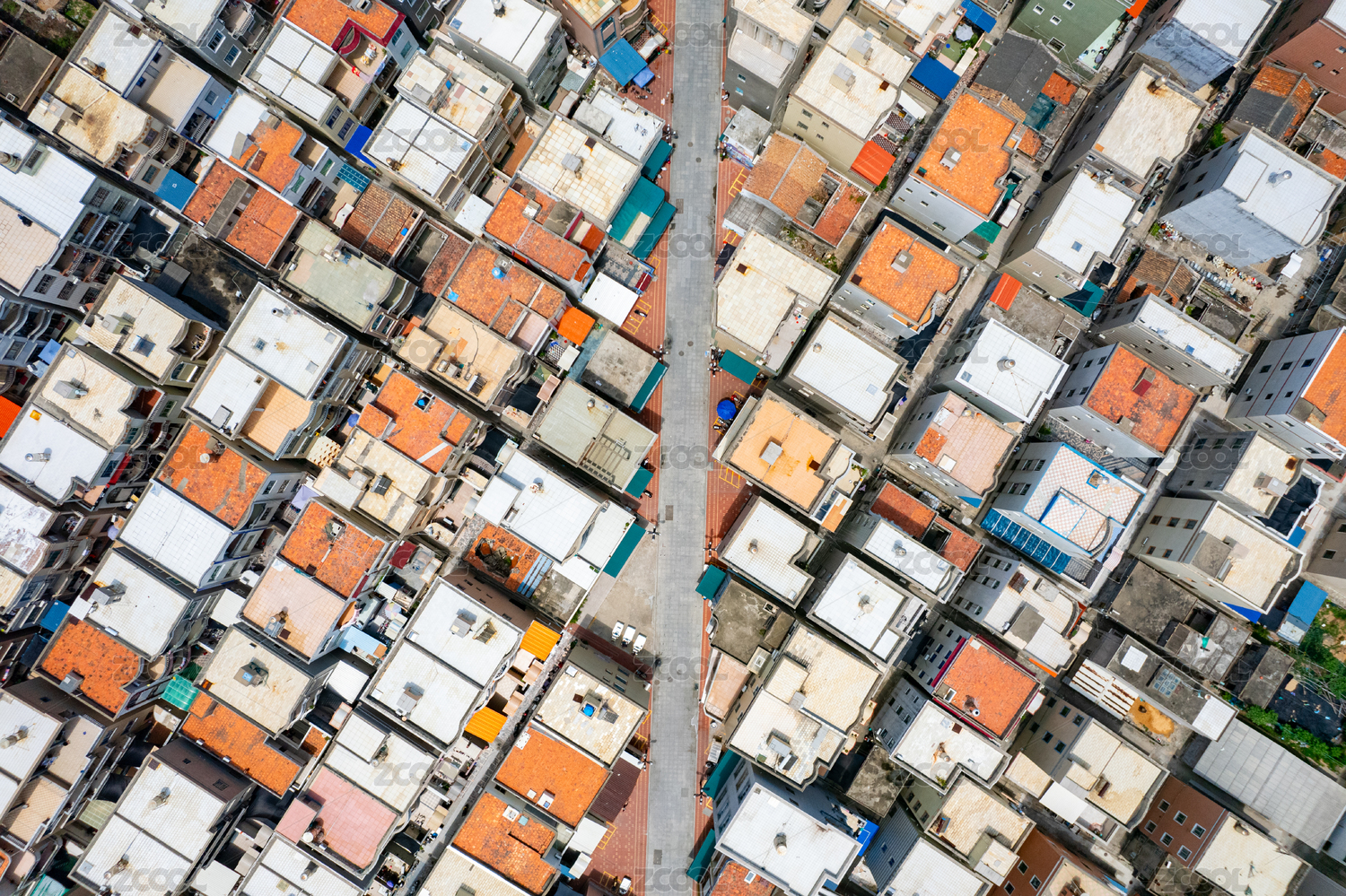 中国传统渔村航拍,临海渔村密集的建筑群俯
