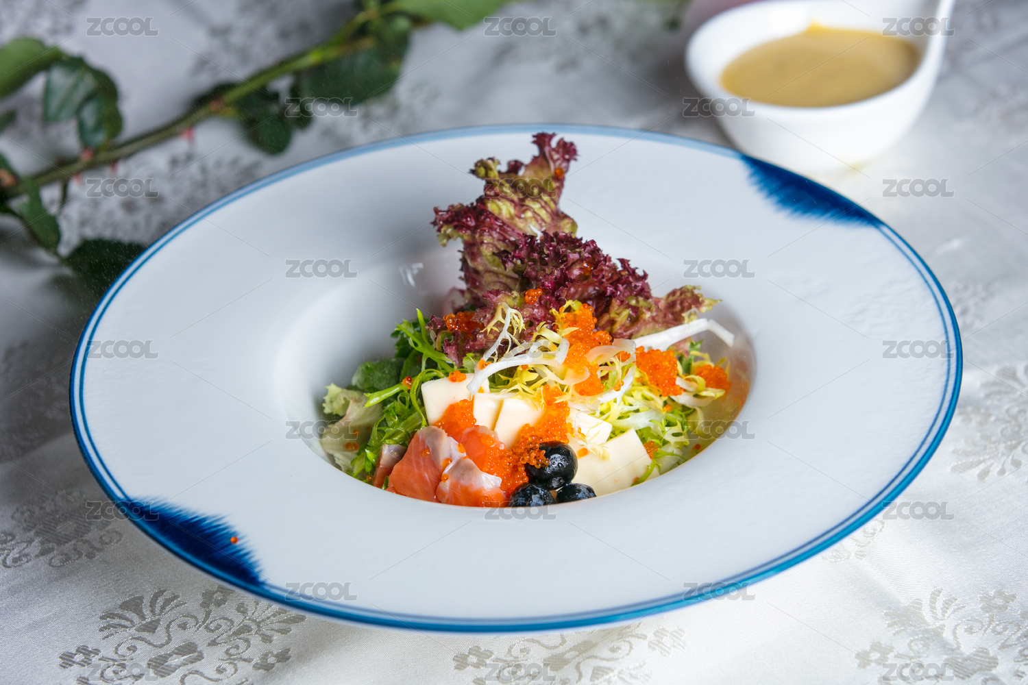鸡肉蔬菜沙拉摆放在桌面上特写