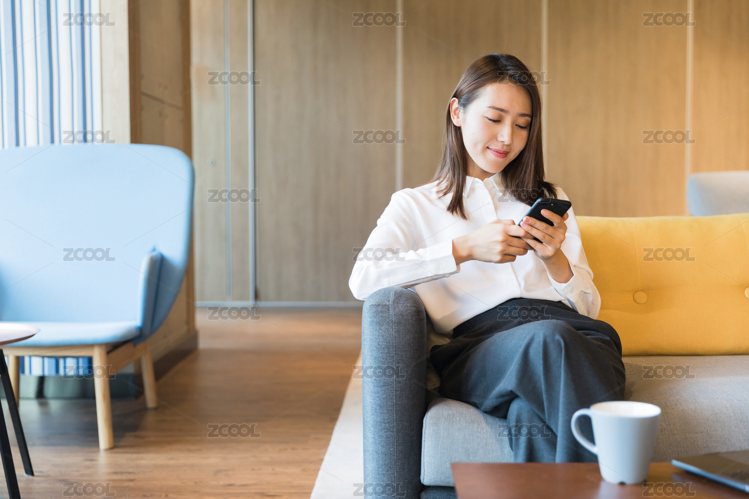 室内办公空间一位职场女性坐在沙发上看电脑