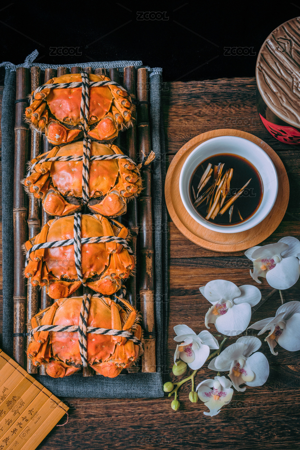 放在木质圆盘里的大闸蟹蒸螃蟹横图