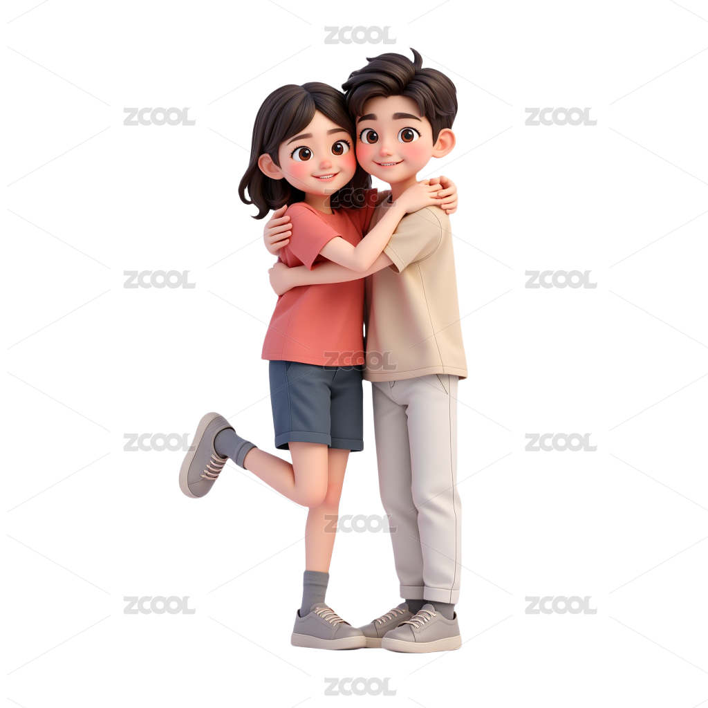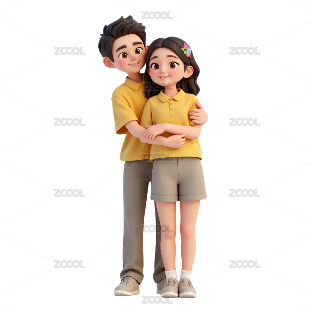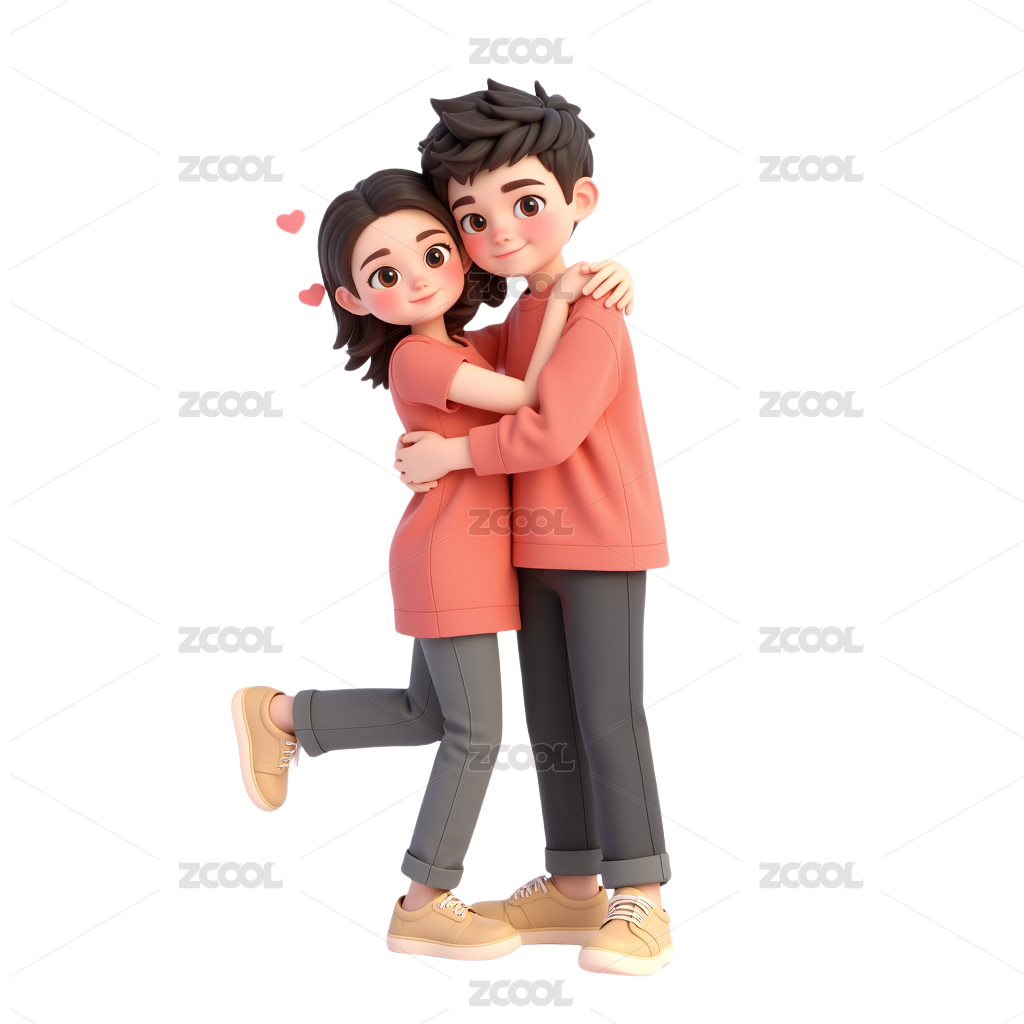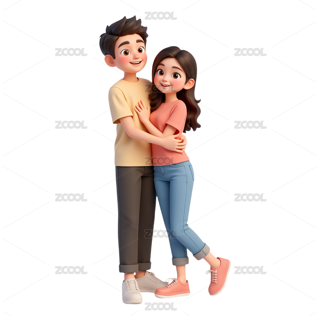 3D风格可爱情侣甜蜜拥抱微笑插画