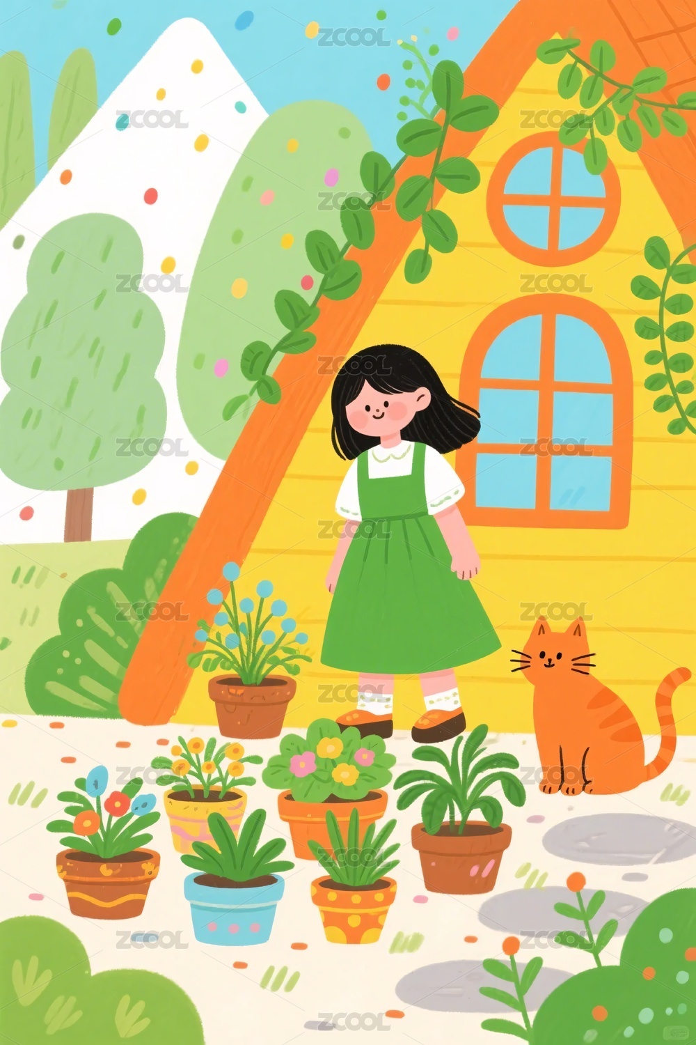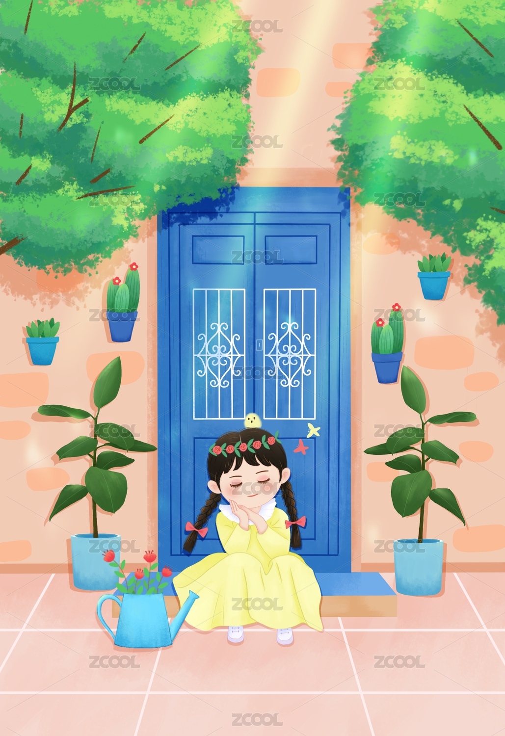 室外穿黄色连衣裙的小女孩坐在门前的台阶上