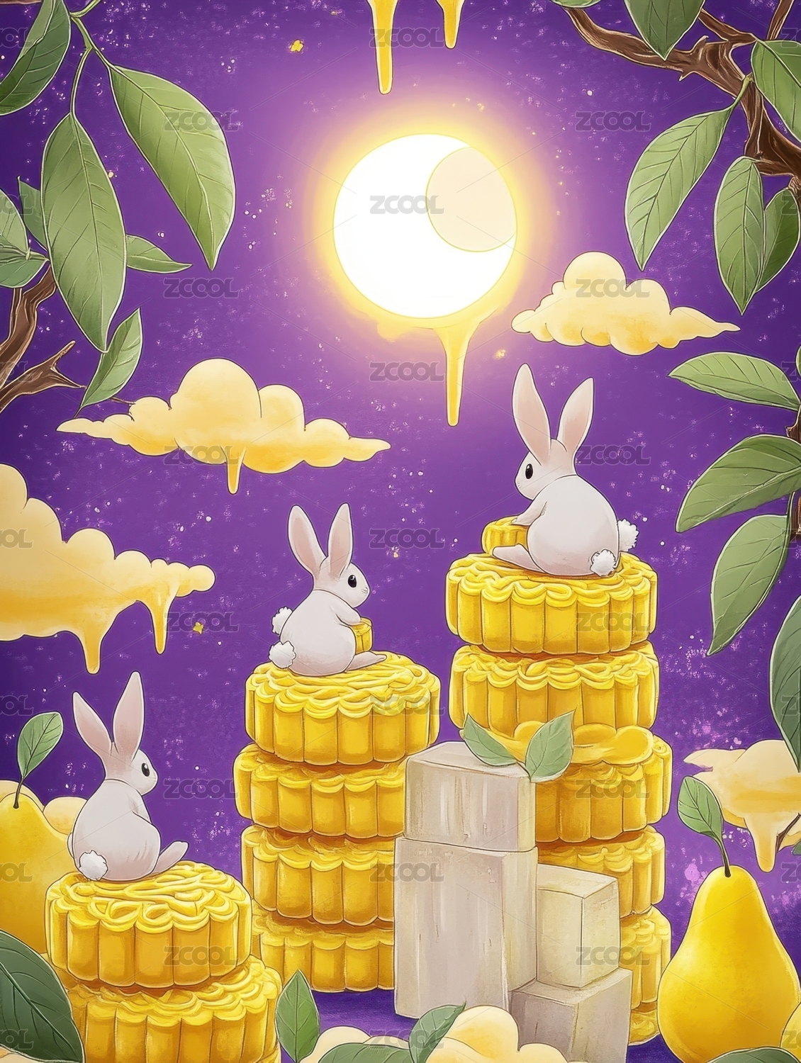中秋节海报插画几只兔子玉兔在月下玩耍庆祝