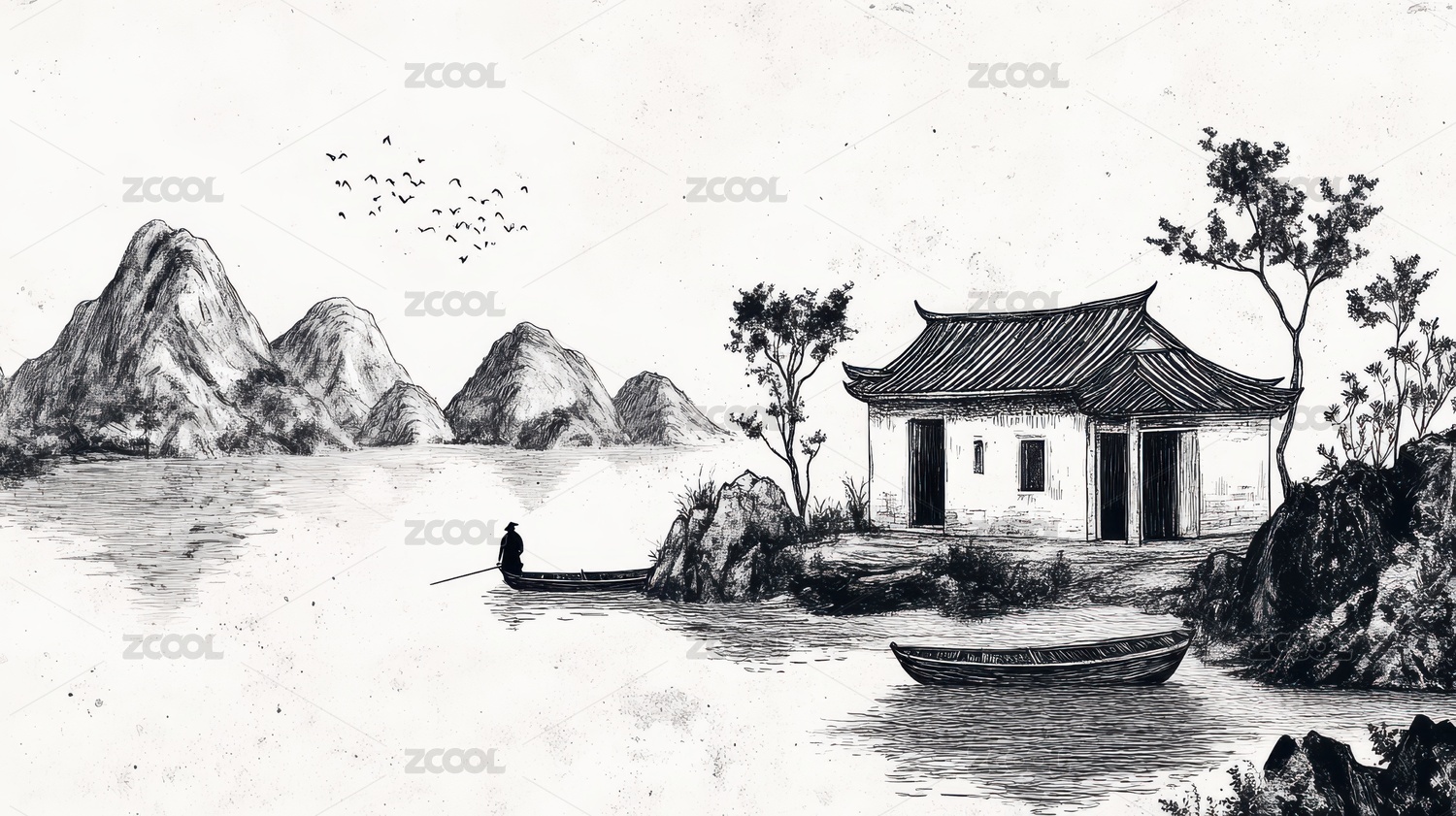 线描风,村落,建筑,建筑群,小屋,美景,民居