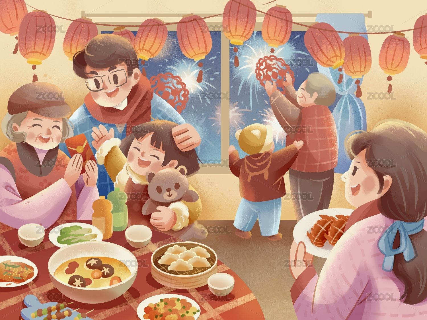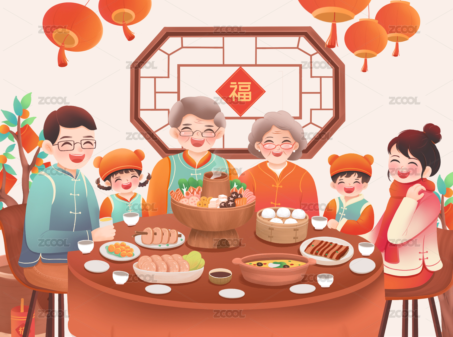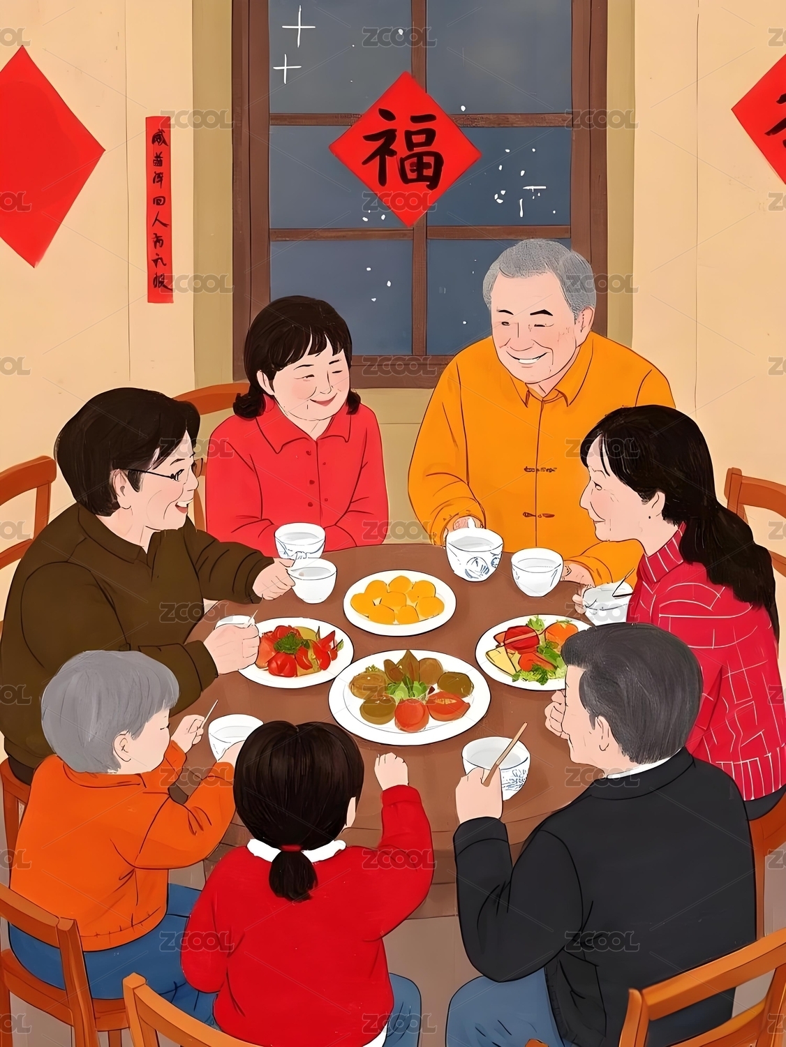 HEBTHXC,新年,过年,年夜饭,家庭,人物,插画,节日,传统,团圆