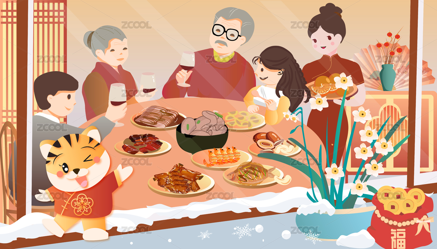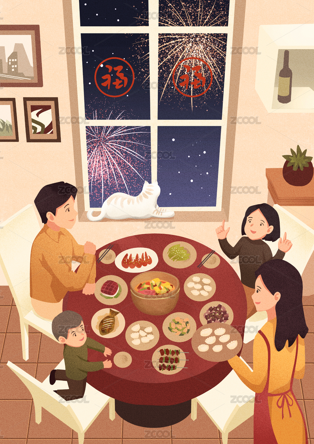 新年春节除夕年夜饭插画