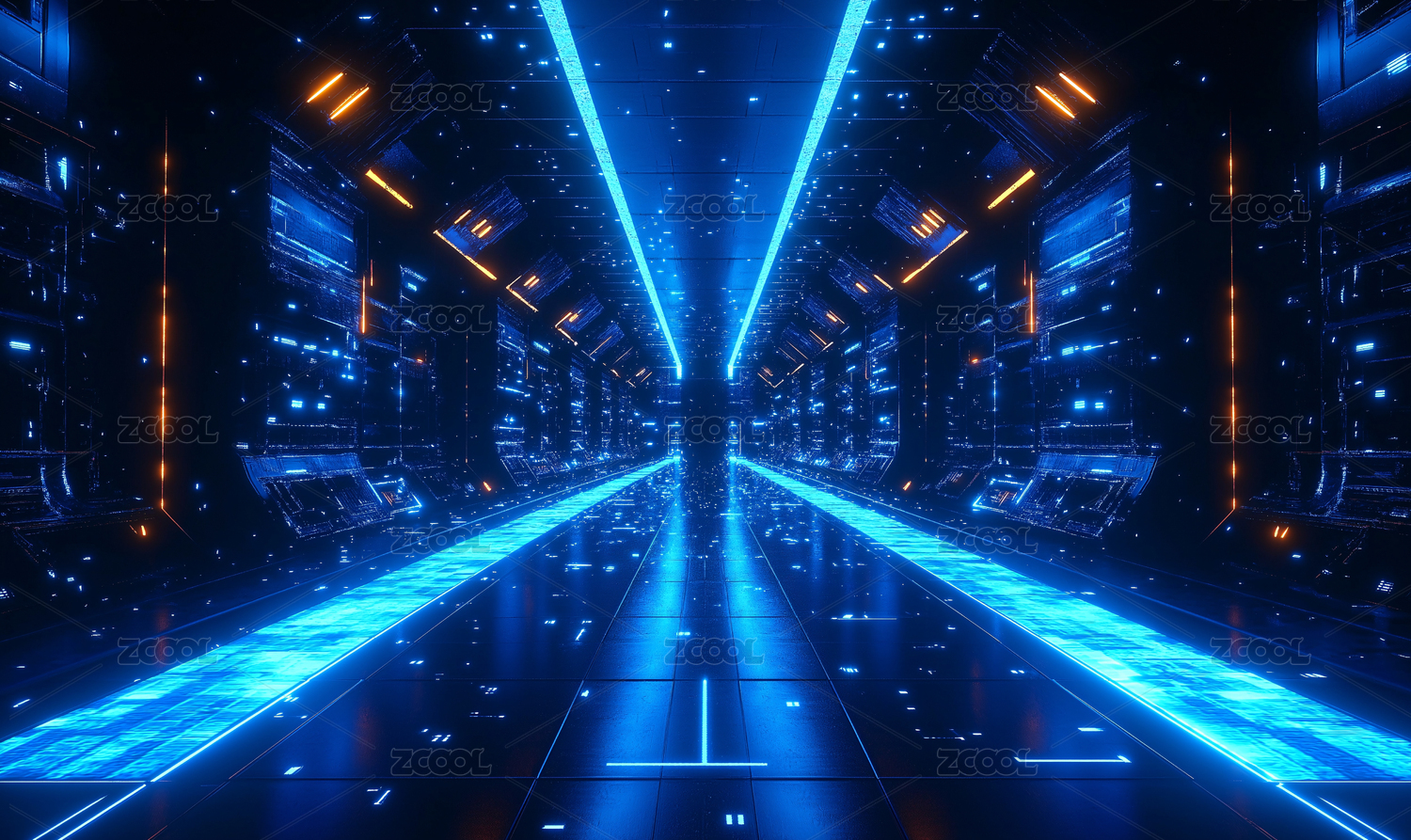 蓝色和橙色霓虹灯构成的未来科技感通道