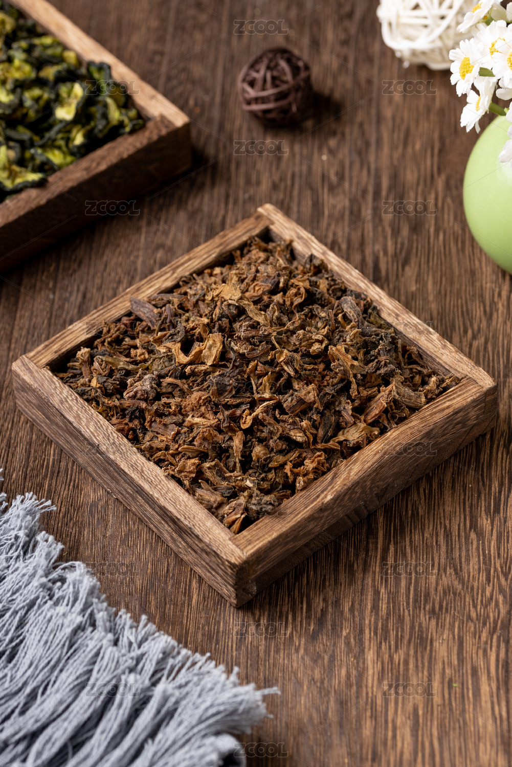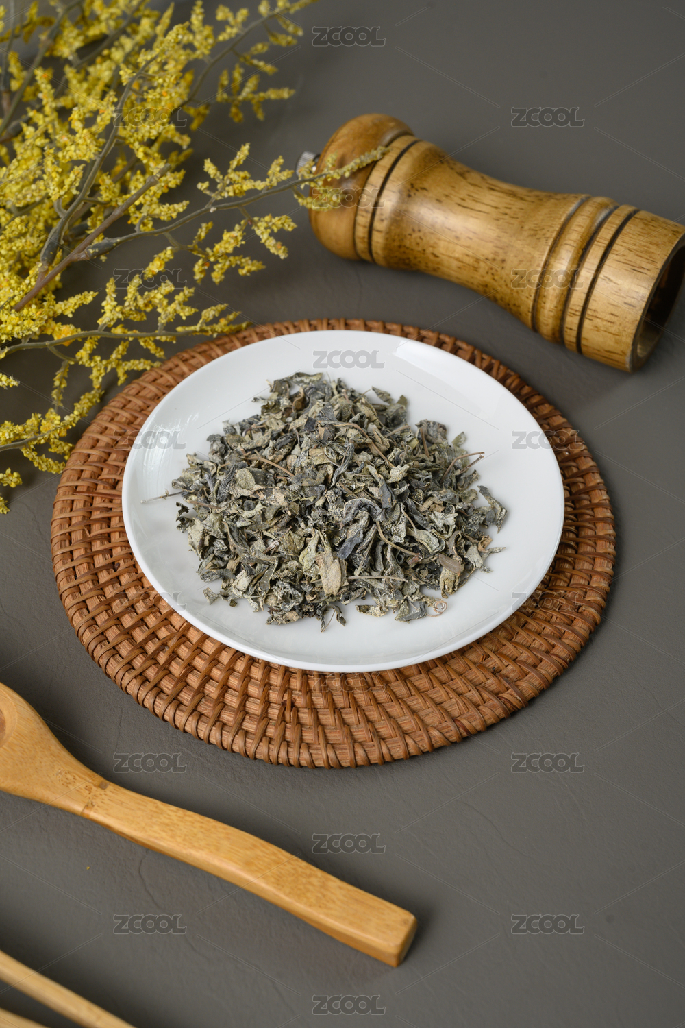 桌面上的盘子里的干爽的丁香茶叶