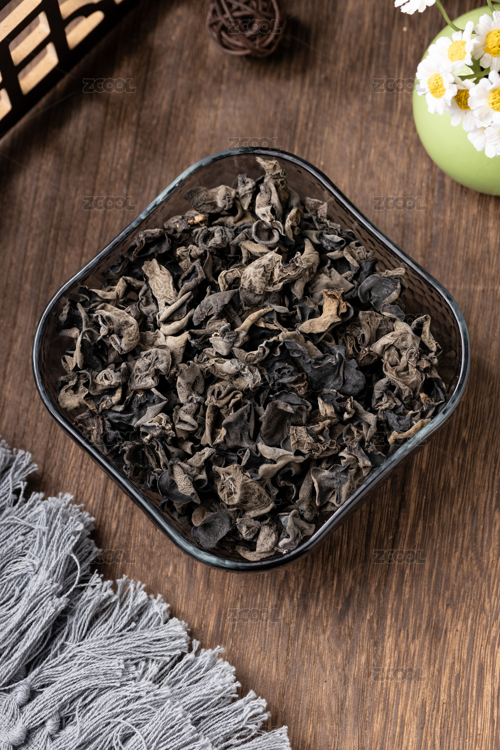 桌面上的盘子粒的干爽的干木耳丝