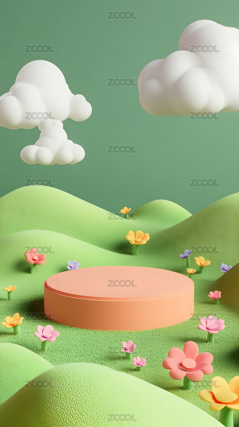3D绿色卡通天空山峰风景圆形电商产品展台