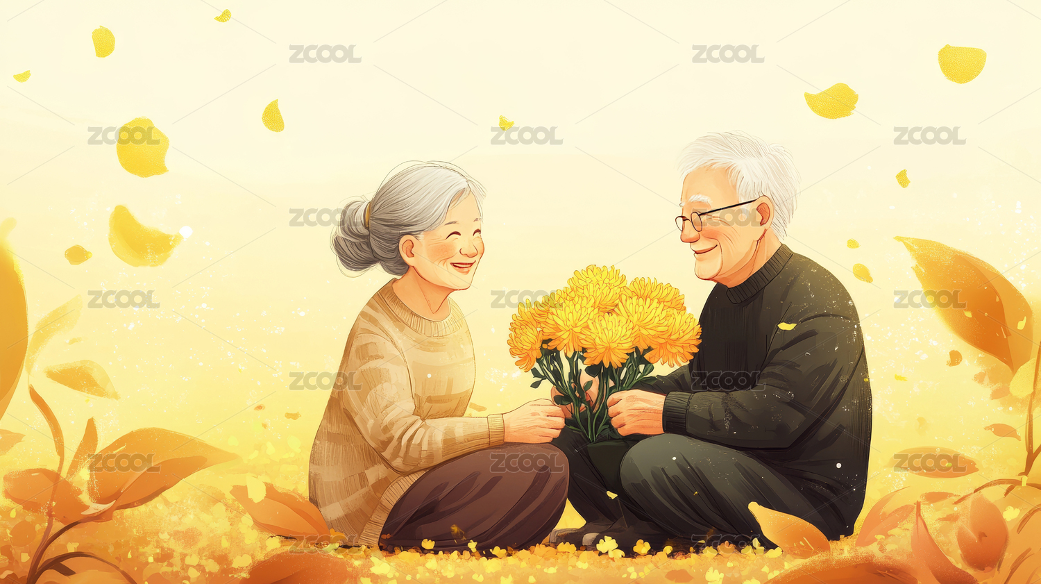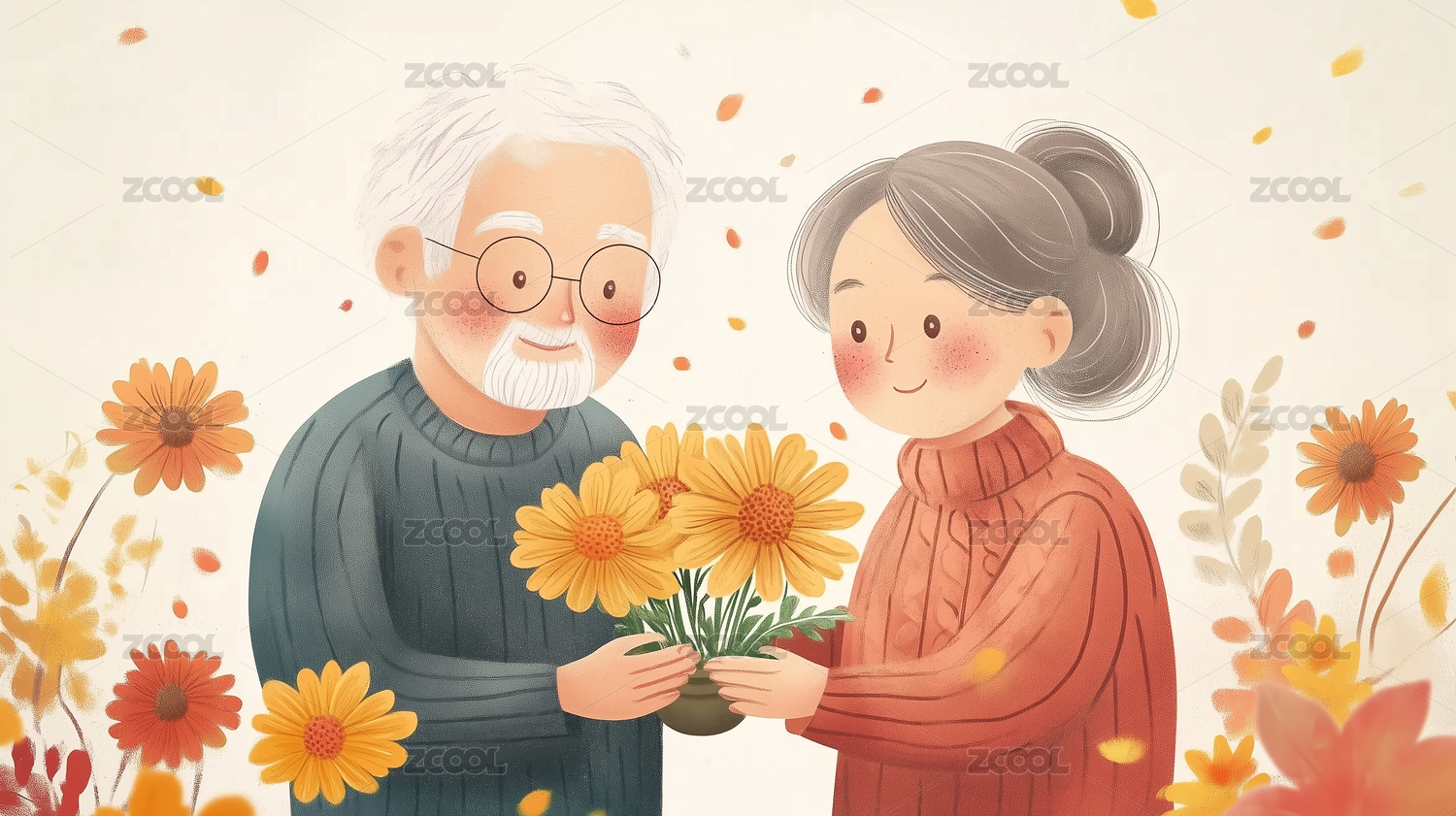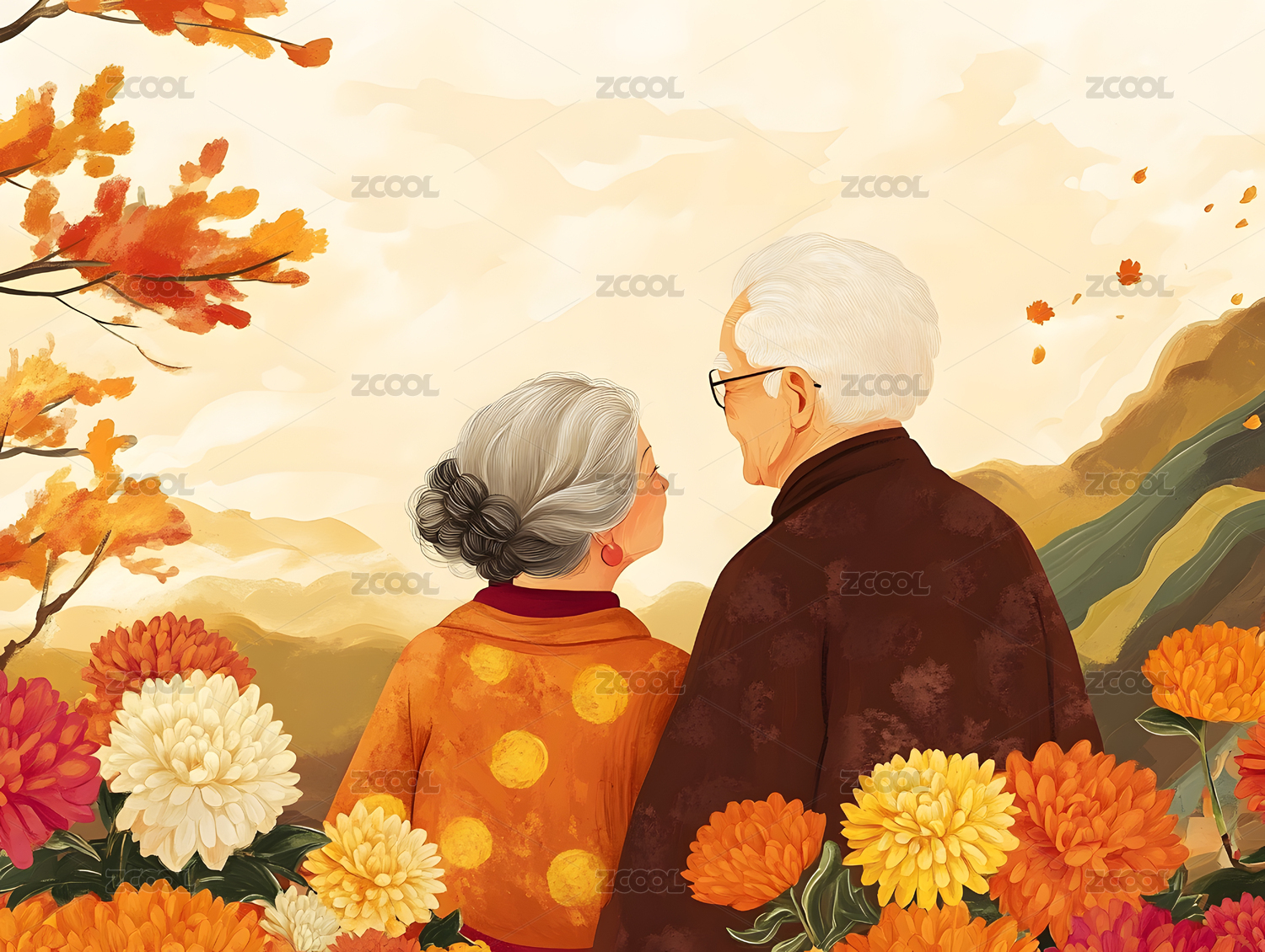 秋天重阳节插画赏菊的老人夫妻