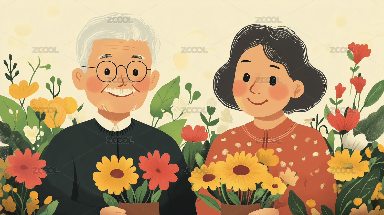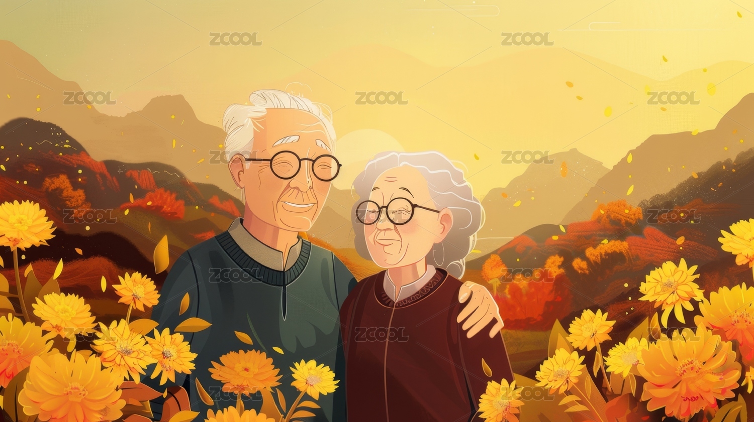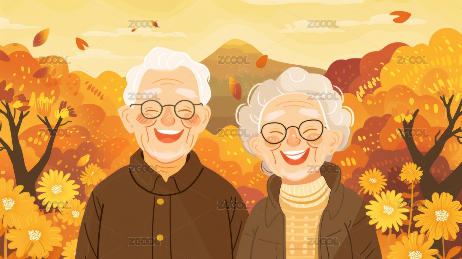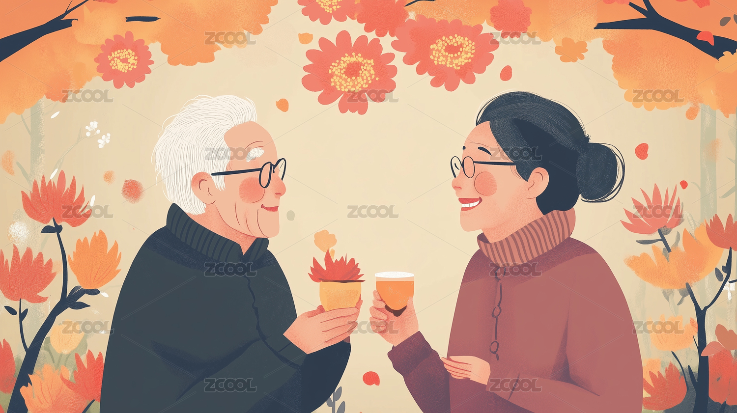 秋天重阳节插画赏菊的老人夫妻
