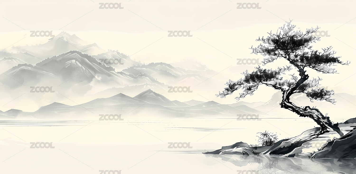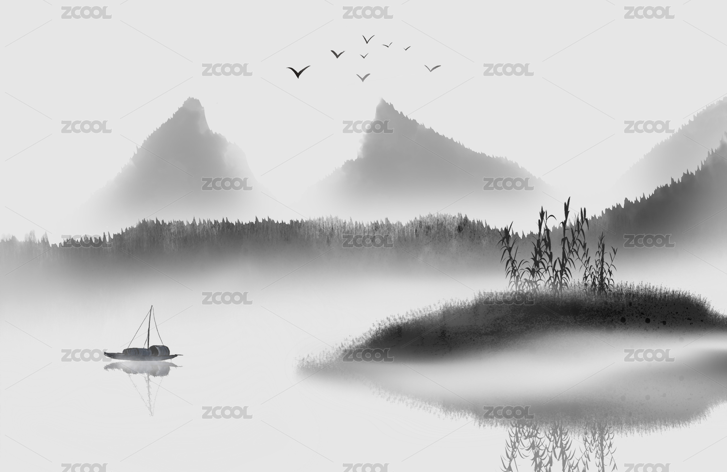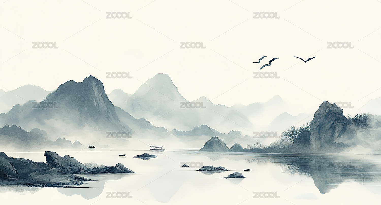 山清水秀的中国传统山水配以雾霭,诗情画意