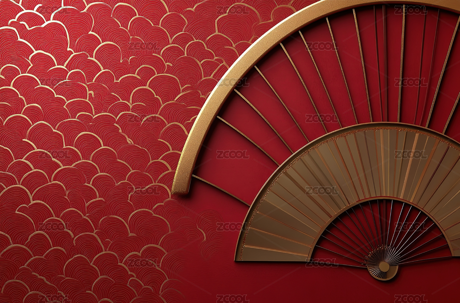 红色波浪纹背景中点缀金色扇形图案